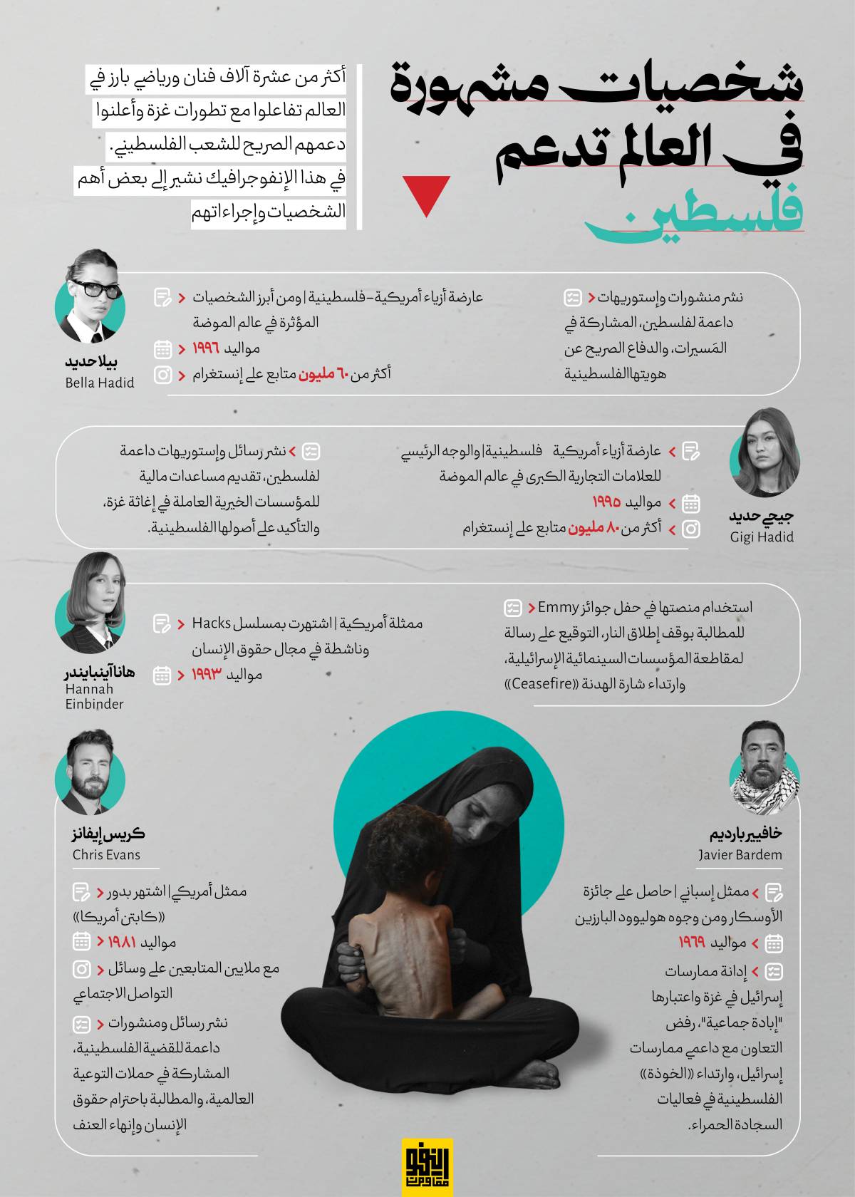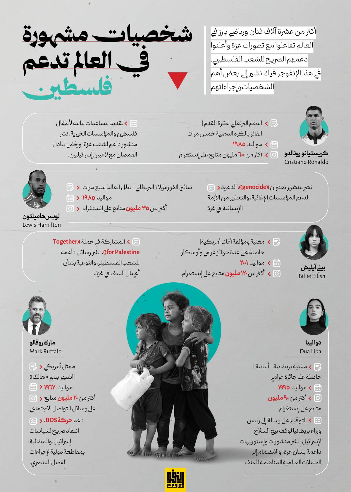 أكثر من عشرة آلاف فنان ورياضي بارز في العالم تفاعلوا مع تطورات غزة وأعلنوا دعمهم الصريح للشعب الفلسطيني.
