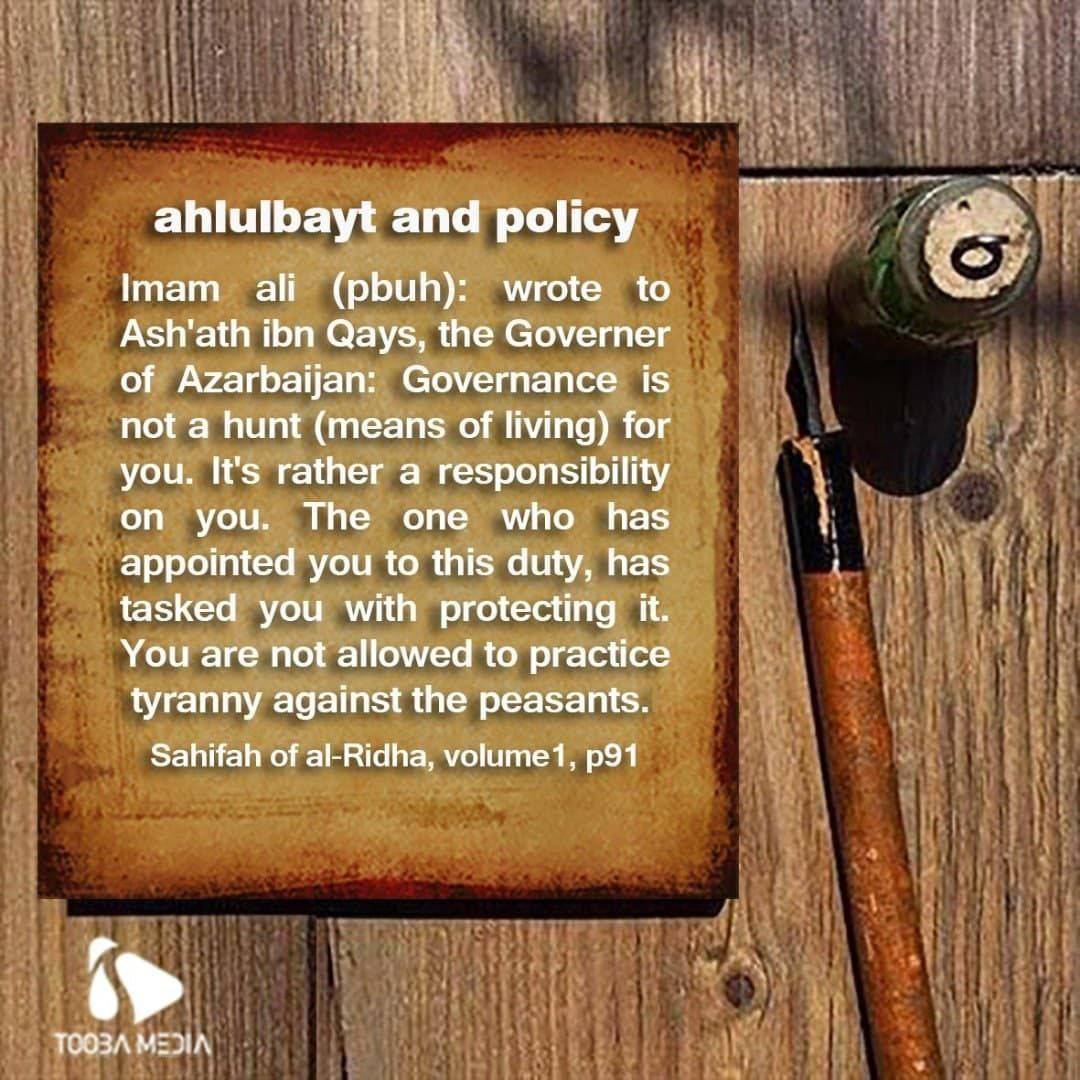 Imam ali wrote to Ash'ath ibn Qays, the Governer of Azarbaijan: Governance is not a hunt (means of living) for you. It's rather a responsibility on you. The one who has appointed you to this duty, has tasked you with protecting it. You are not allowed to practice tyranny against the peasants.