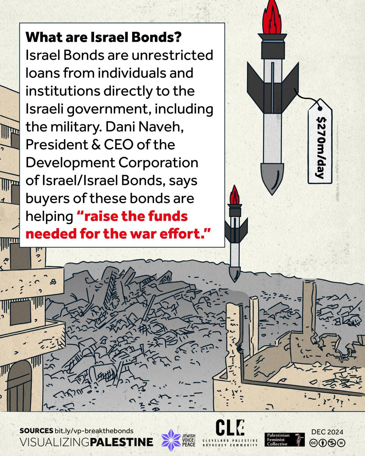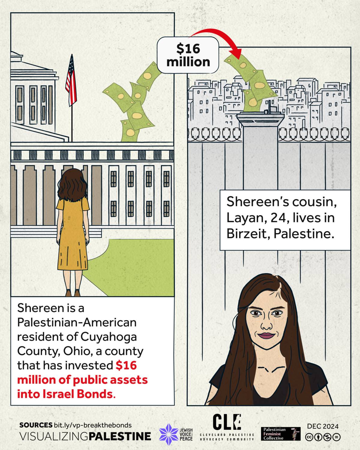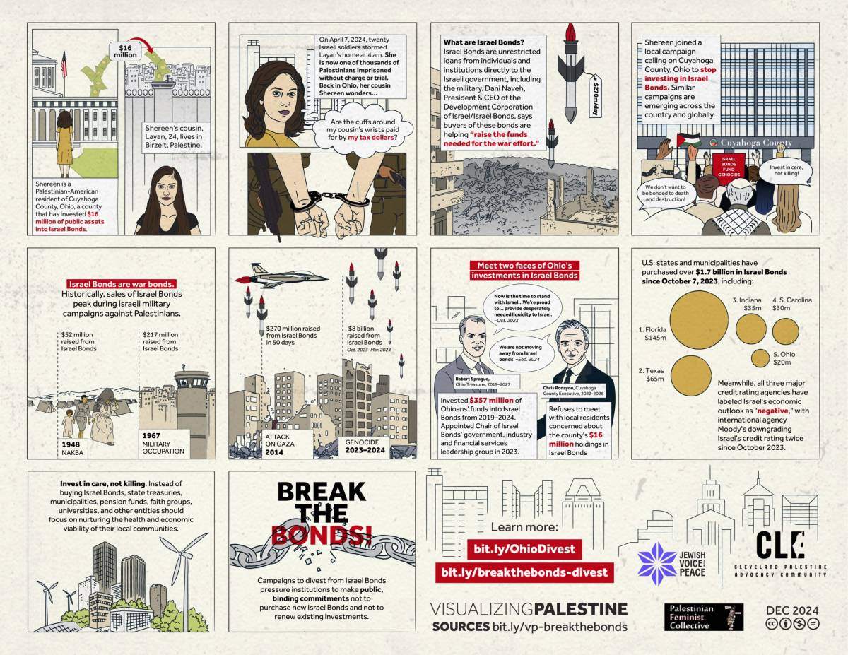 [December 2024]. Cuyahoga County, Ohio organizers are pressuring their municipality to stop using millions in public funds to buy Israel Bonds. To support their vital efforts and the broader Break the Bonds campaign, we partnered with the Cleveland Palestine Advocacy Community, Jewish Voice for Peace, and the Palestinian Feminist Collective on this visual explainer of Israel Bonds, their role in sustaining colonialism and genocide, and what we can do about it.