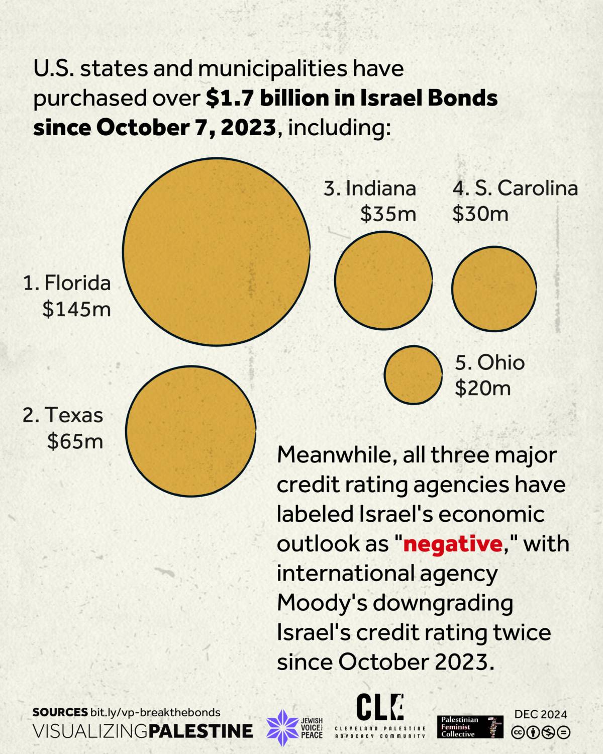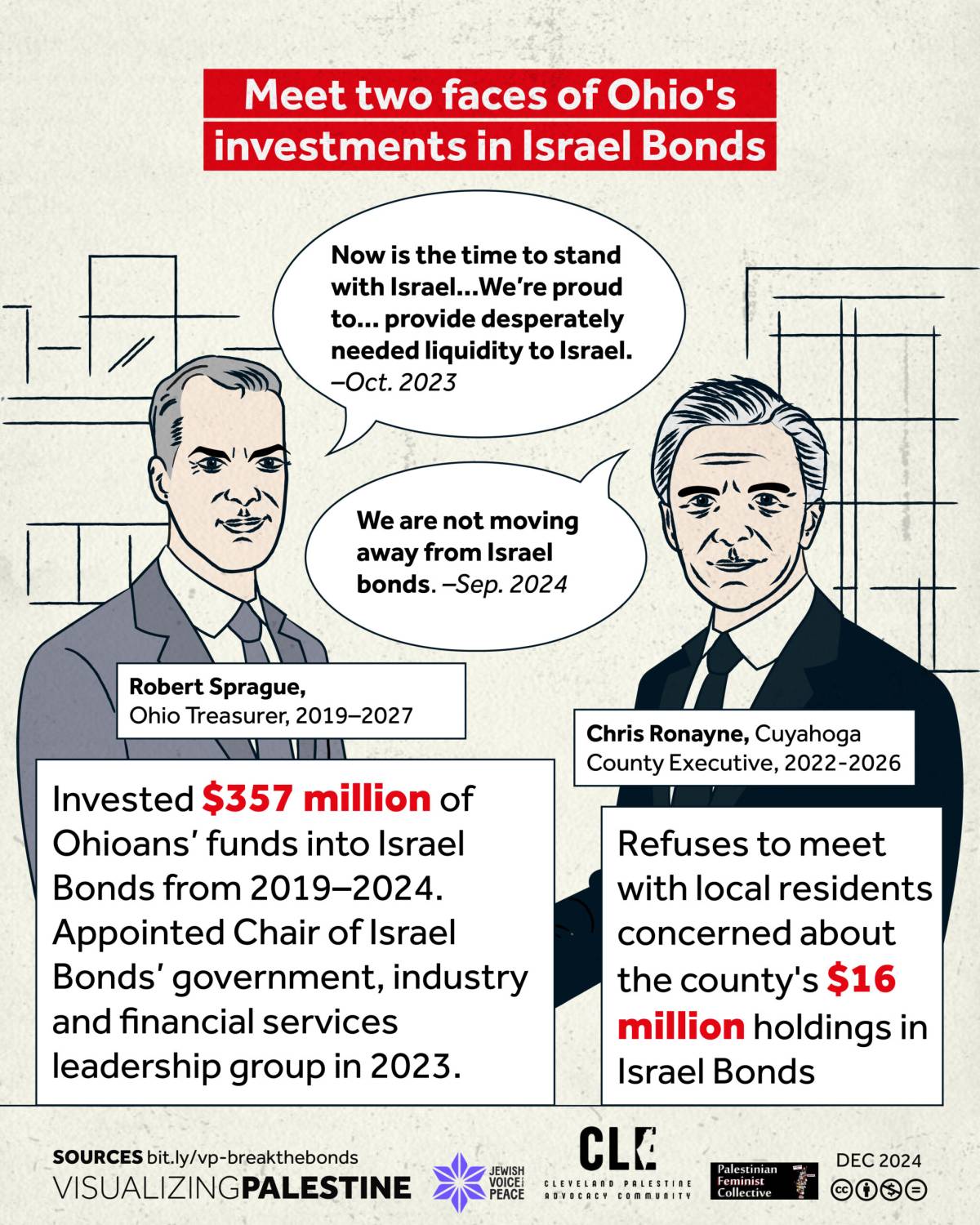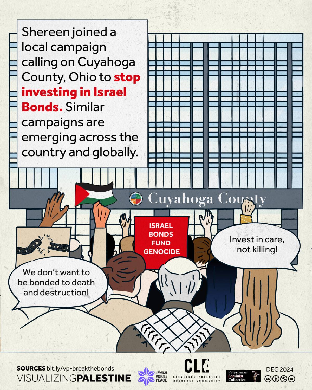 [December 2024]. Cuyahoga County, Ohio organizers are pressuring their municipality to stop using millions in public funds to buy Israel Bonds. To support their vital efforts and the broader Break the Bonds campaign, we partnered with the Cleveland Palestine Advocacy Community, Jewish Voice for Peace, and the Palestinian Feminist Collective on this visual explainer of Israel Bonds, their role in sustaining colonialism and genocide, and what we can do about it.