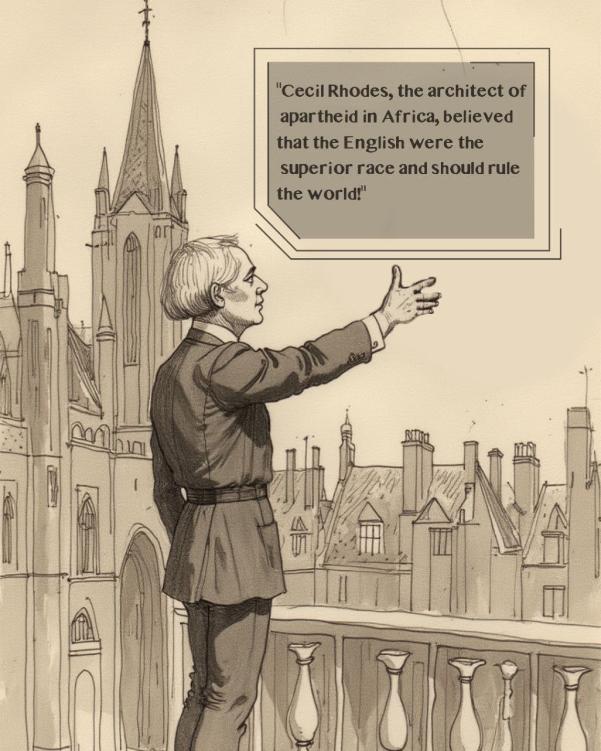 "Cecil Rhodes, the architect of psrtheid in Africa, believed that the English were the superior race and should rule thr world!"