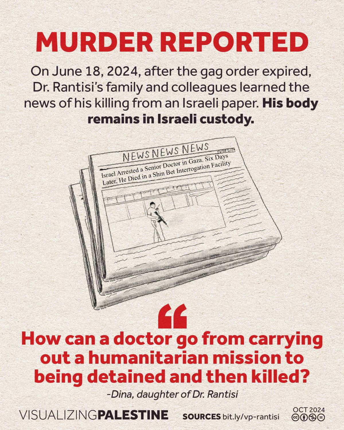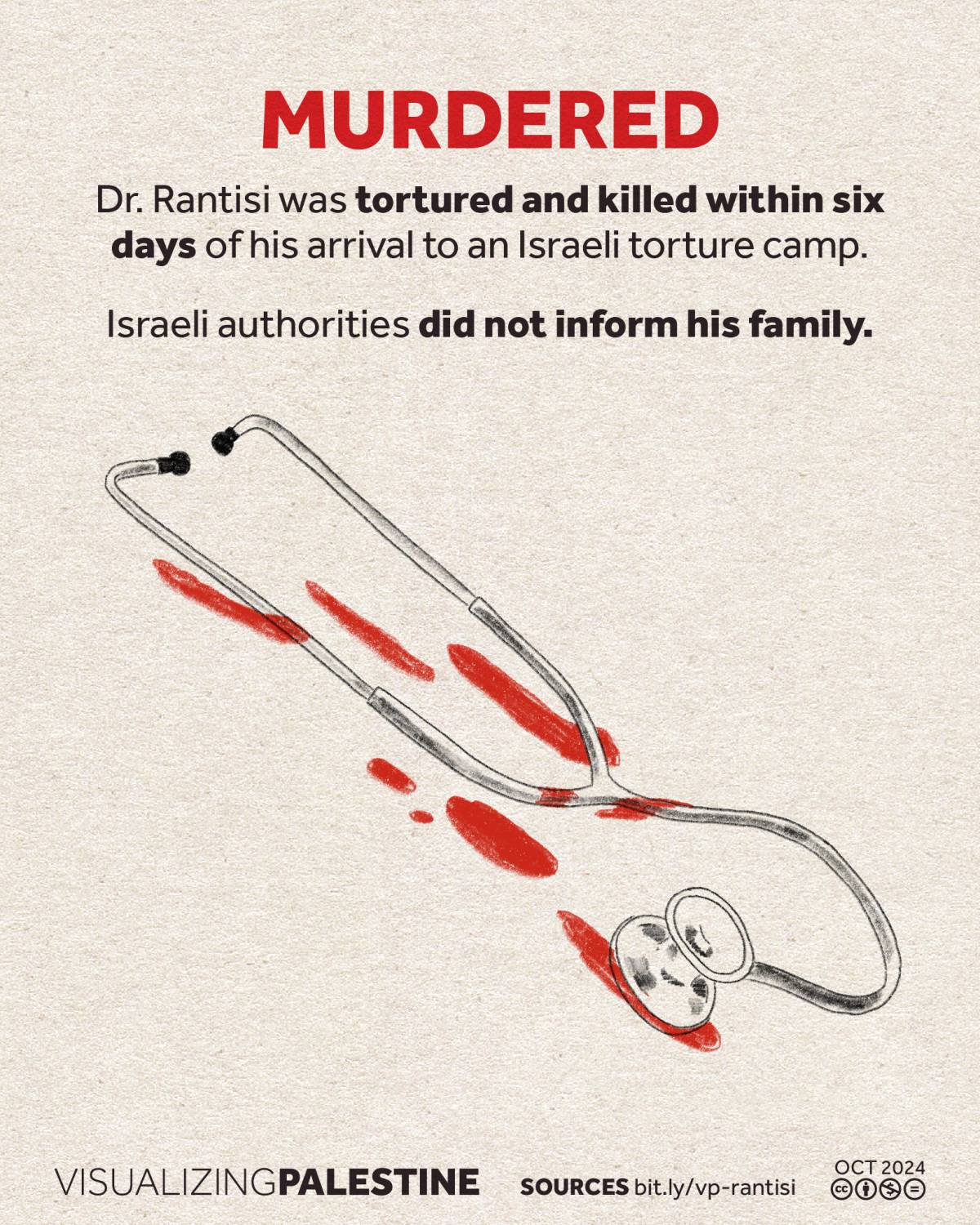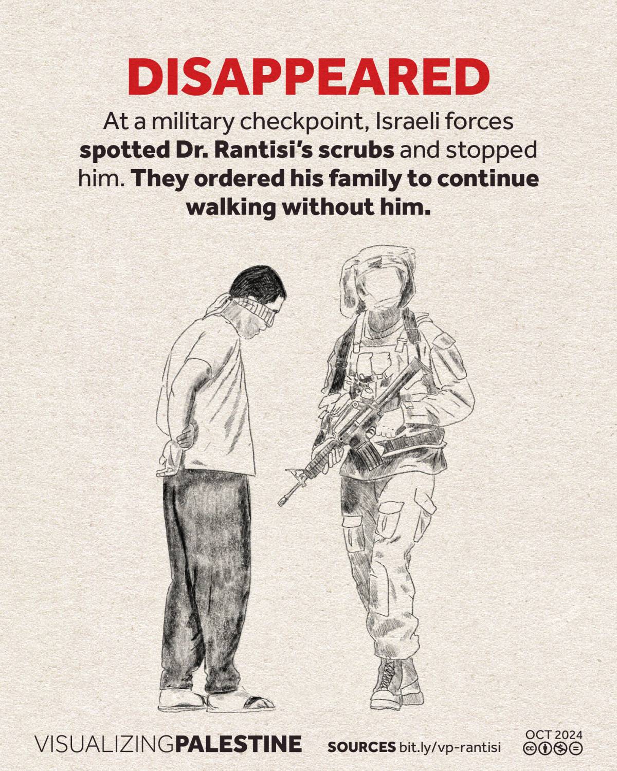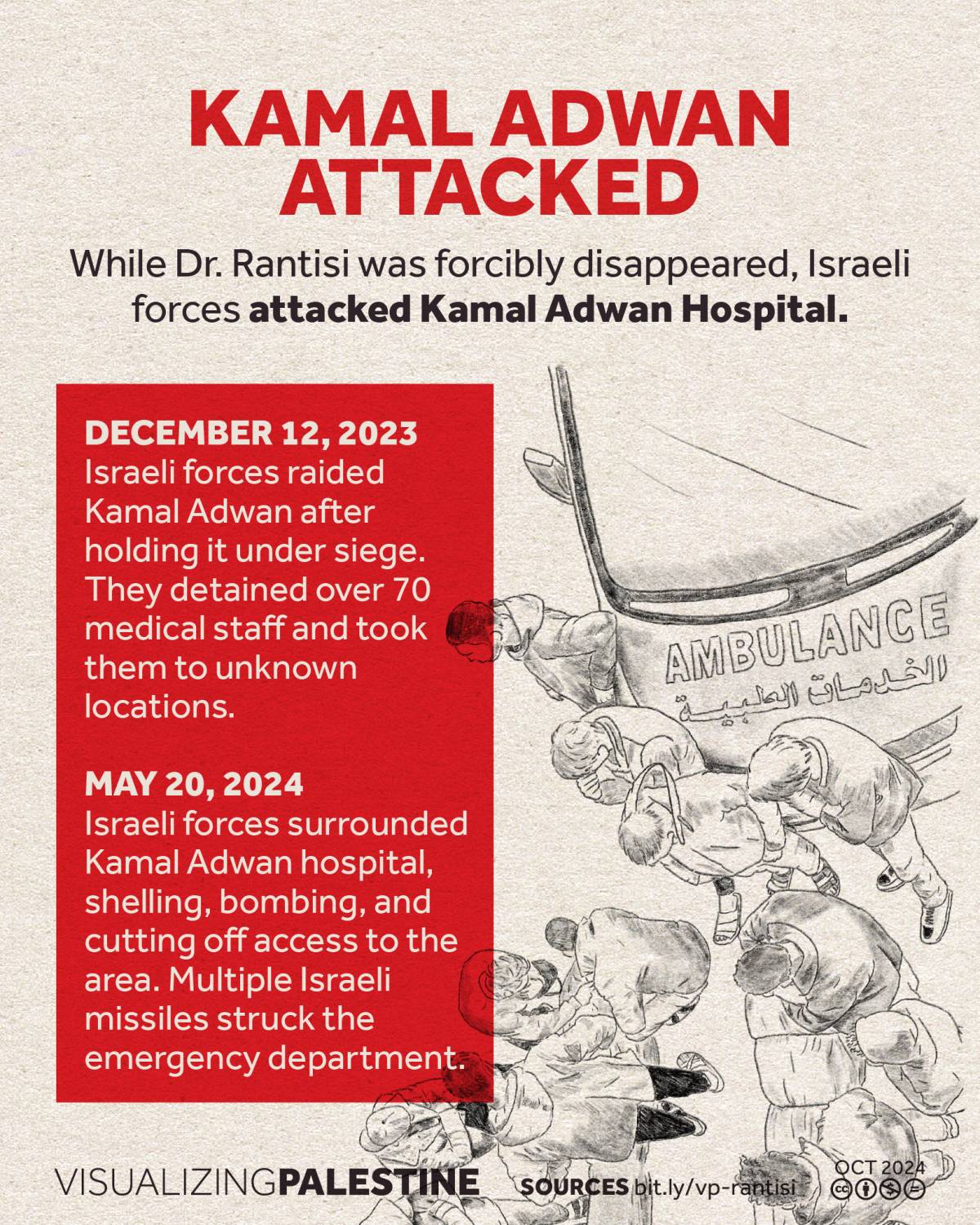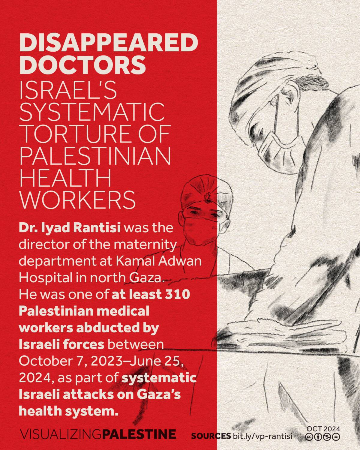 This visual highlights the continuous targeting of Palestinian healthcare workers and facilities by Israeli forces in Gaza, focusing on the enforced disappearance, torture, and murder of Dr. Iyad Rantisi, the director of the maternity department at Kamal Adwan Hospital.