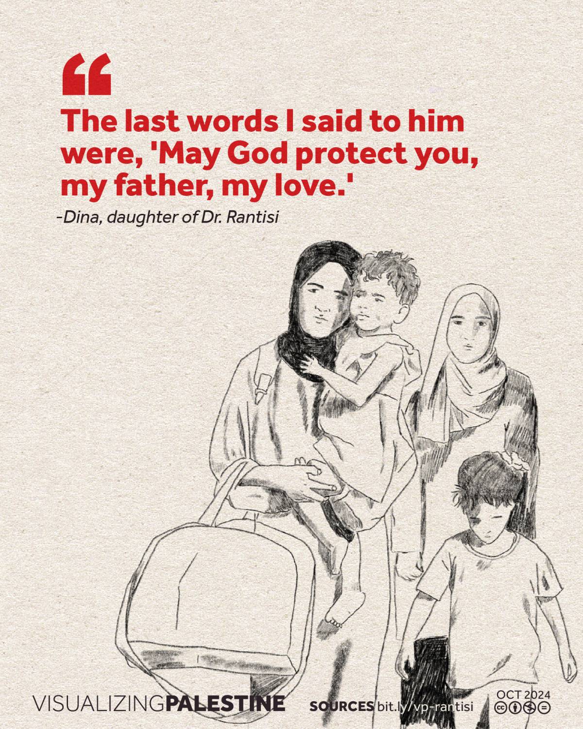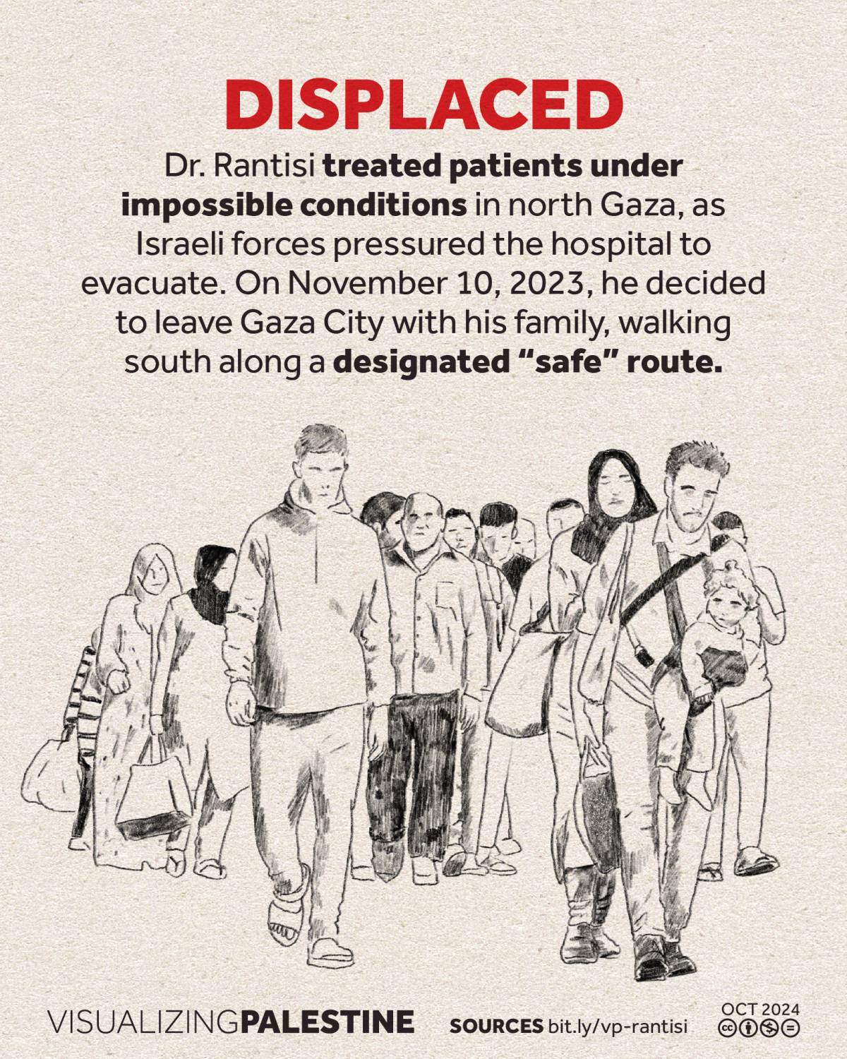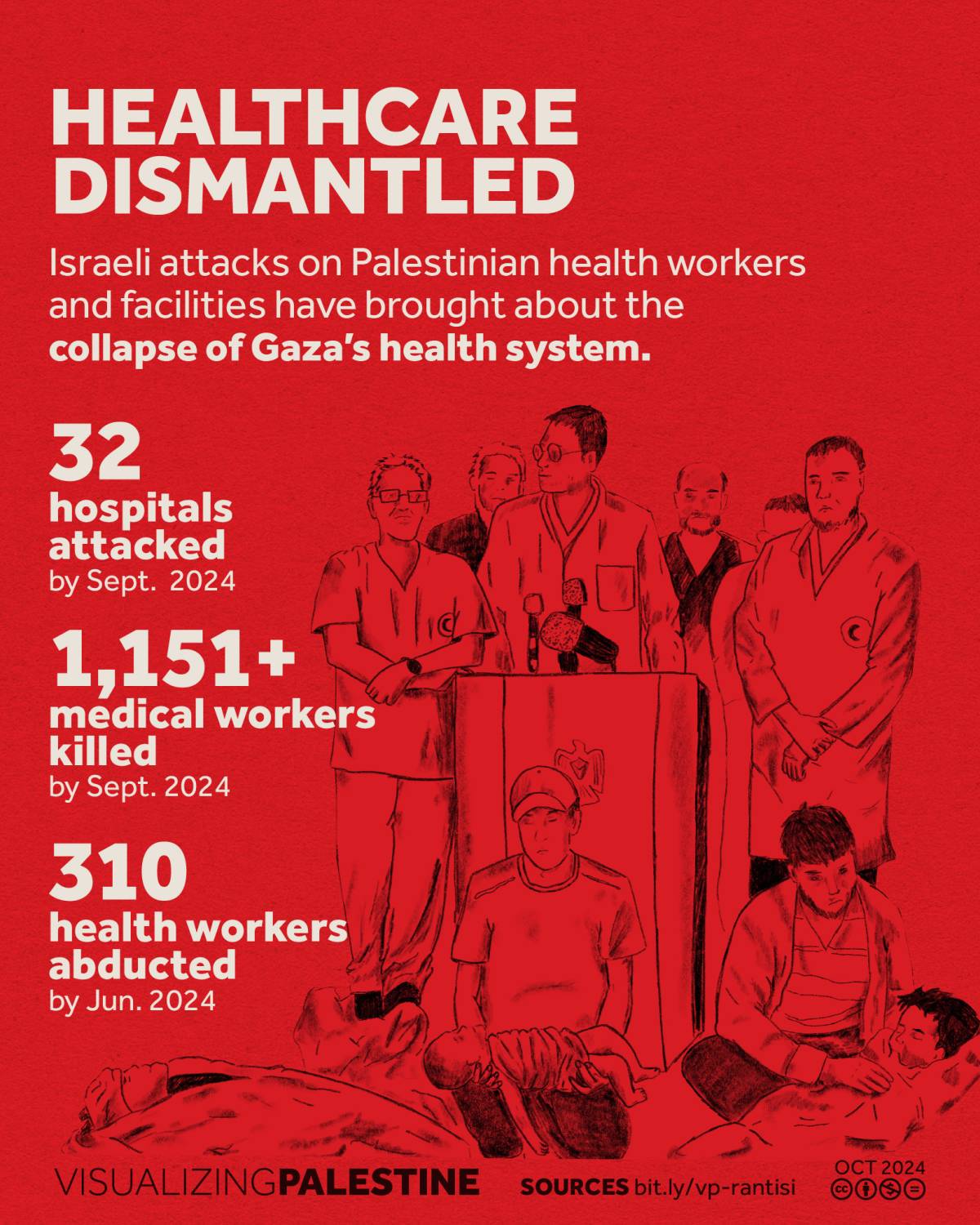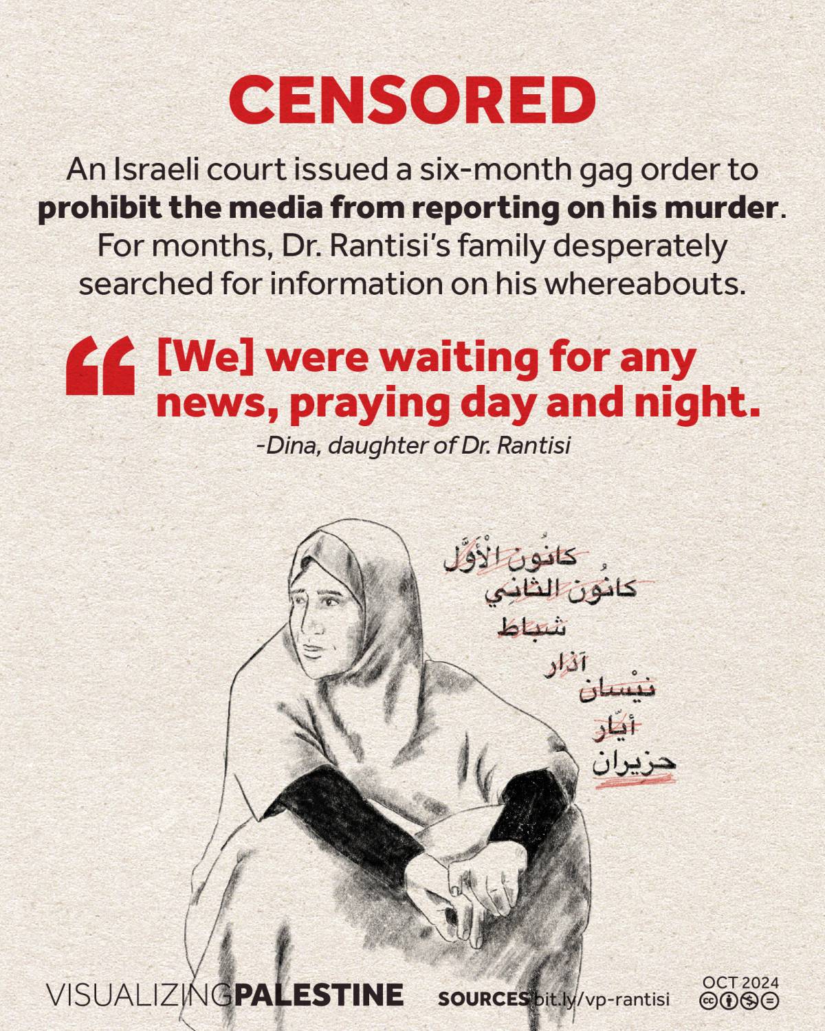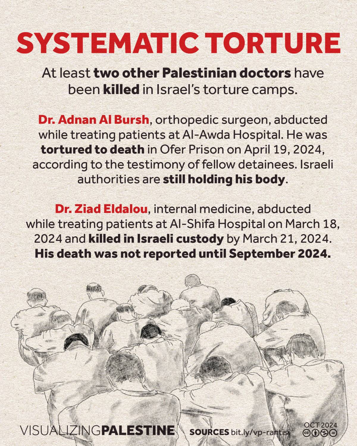 This visual highlights the continuous targeting of Palestinian healthcare workers and facilities by Israeli forces in Gaza, focusing on the enforced disappearance, torture, and murder of Dr. Iyad Rantisi, the director of the maternity department at Kamal Adwan Hospital.