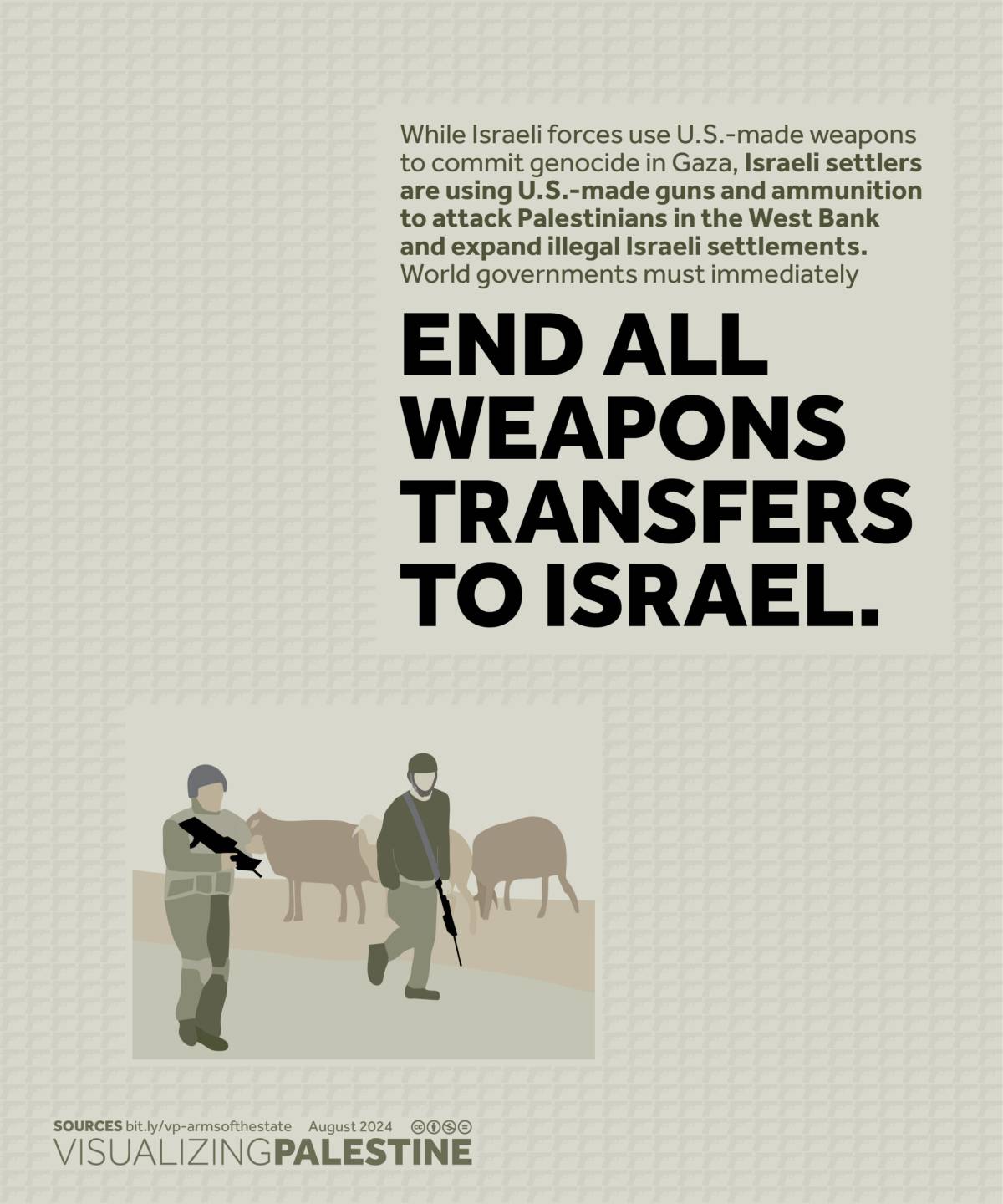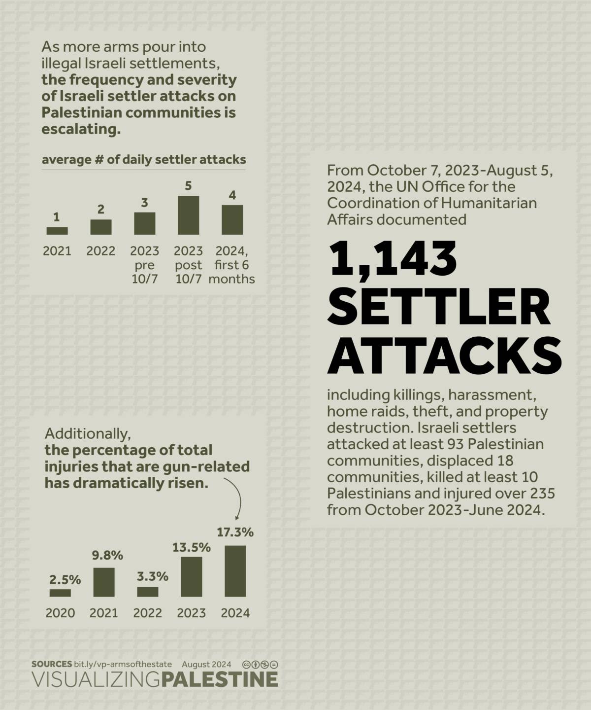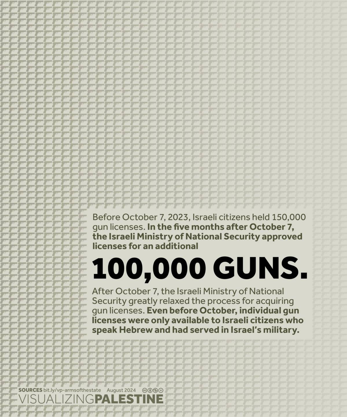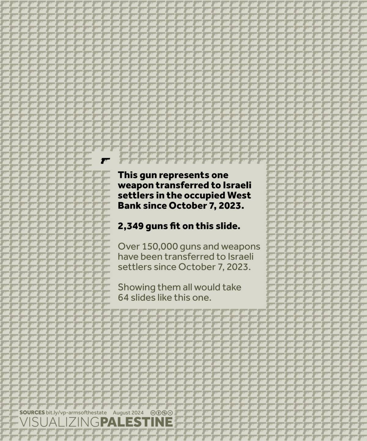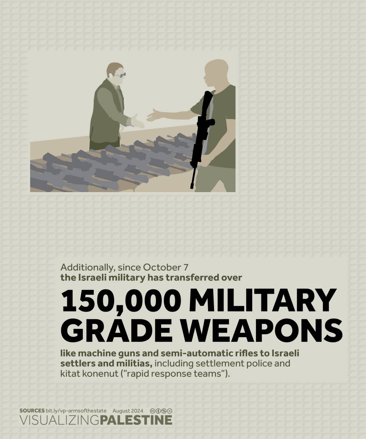 This visual captures how the Israeli government has transferred hundreds of thousands of guns and other weapons to Israeli settlers since October 7, 2023, as settler violence against Palestinian communities skyrockets with impunity.