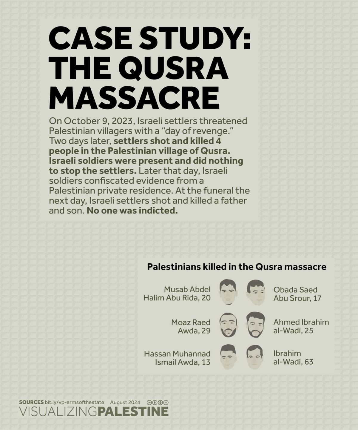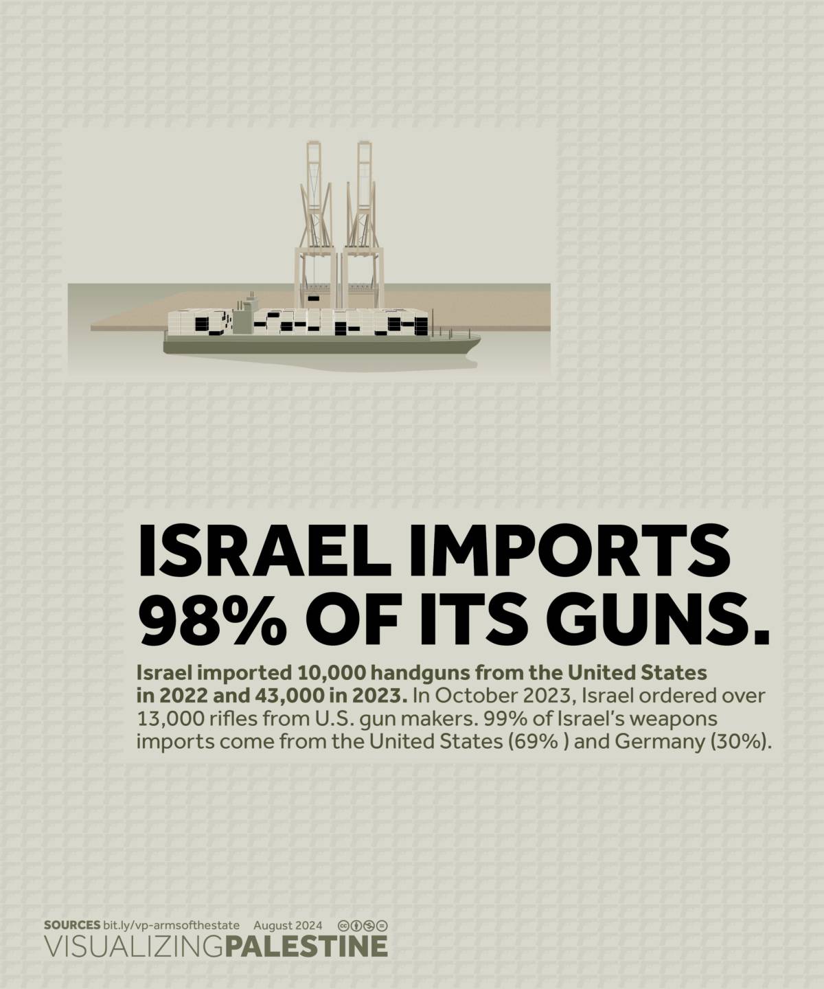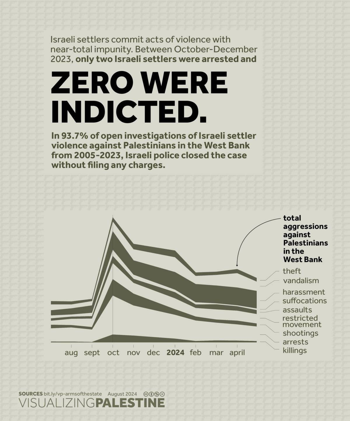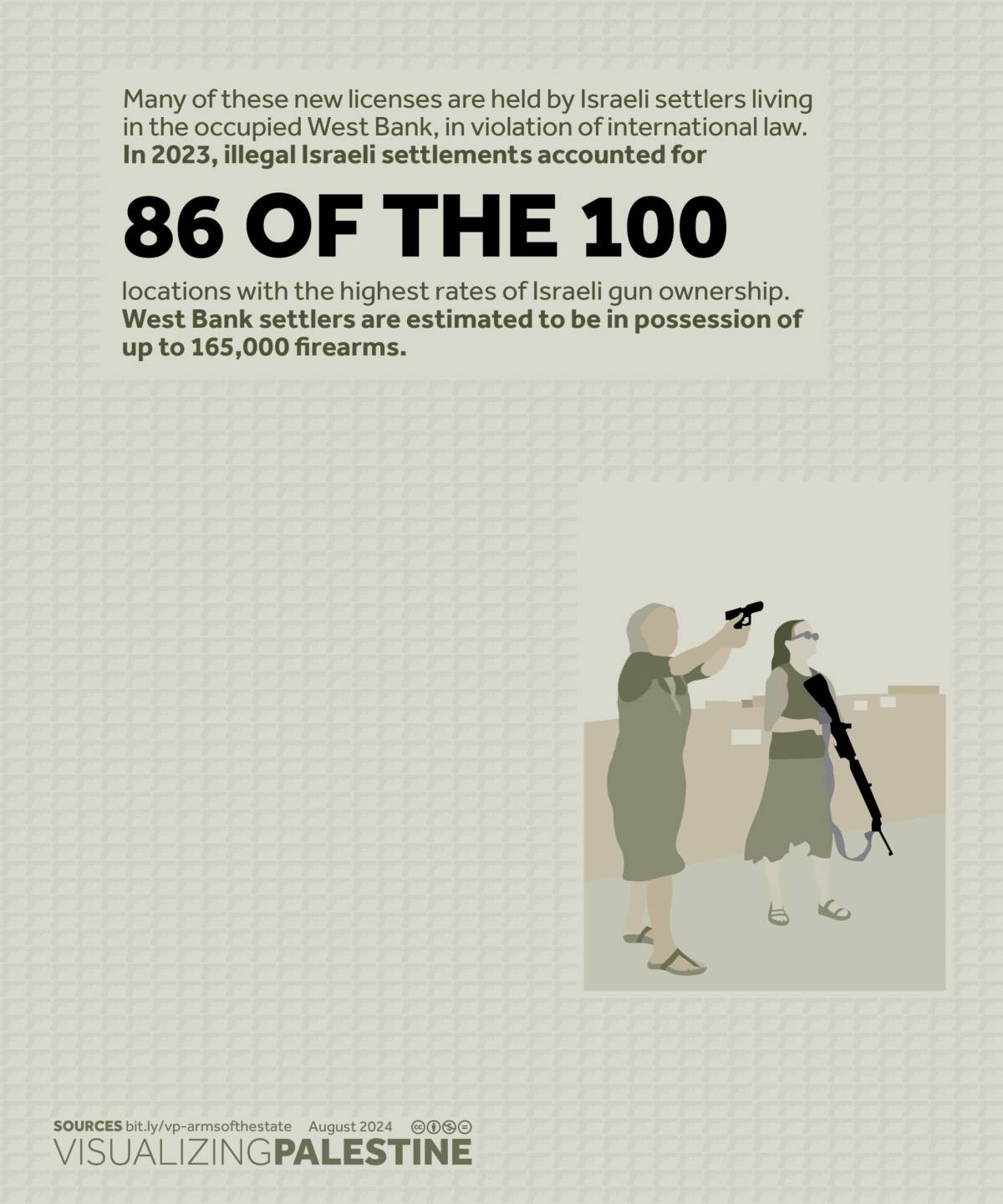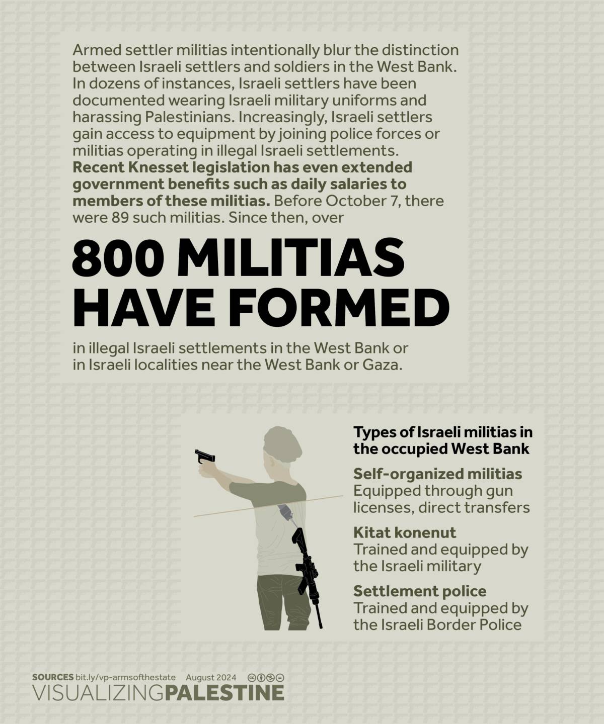 This visual captures how the Israeli government has transferred hundreds of thousands of guns and other weapons to Israeli settlers since October 7, 2023, as settler violence against Palestinian communities skyrockets with impunity.