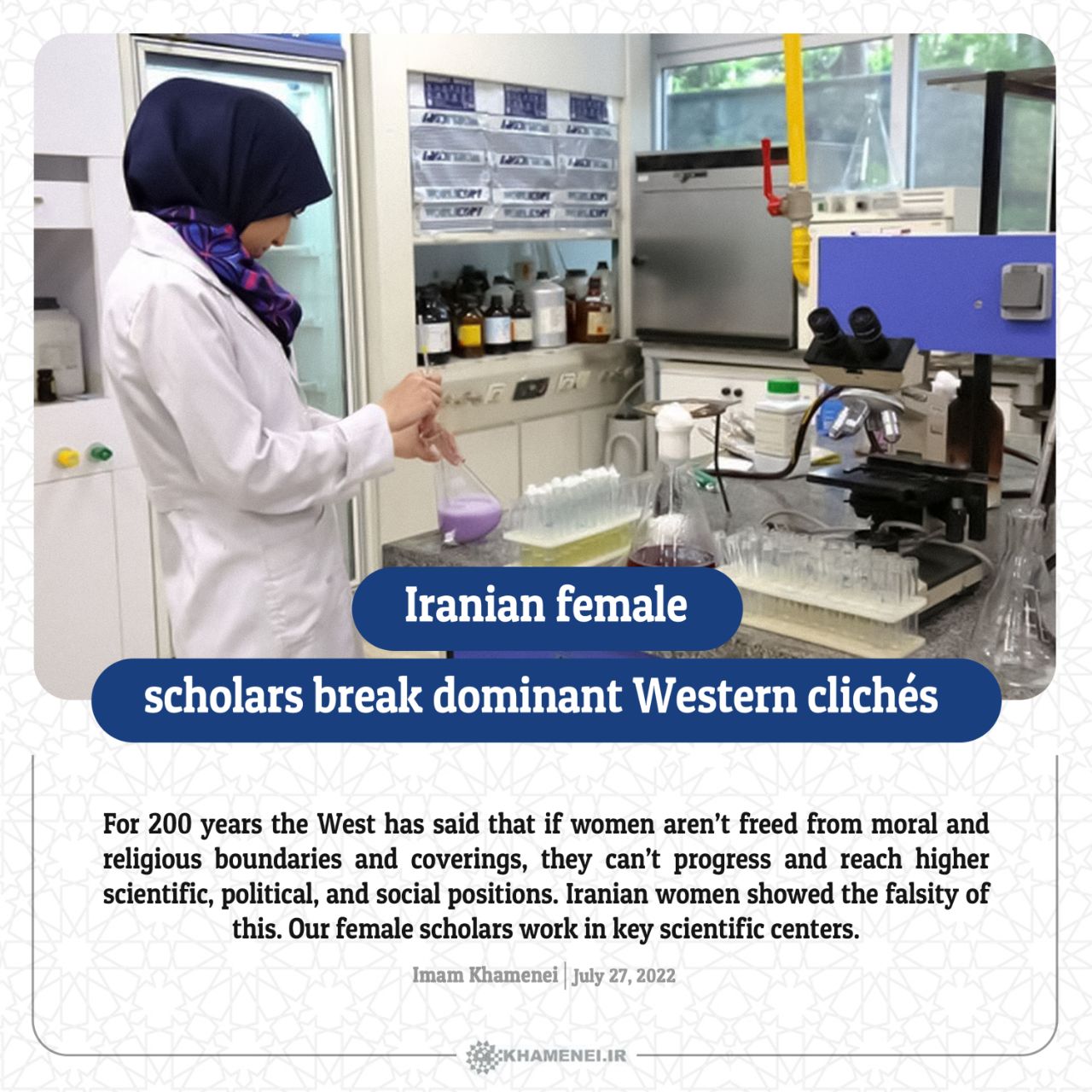 For 200 years the West has said that if women aren’t freed from moral and religious boundaries and coverings, they can’t progress and reach higher scientific, political, and social positions. Iranian women showed the falsity of this. Our female scholars work in key scientific centers.