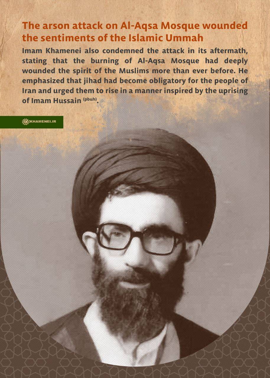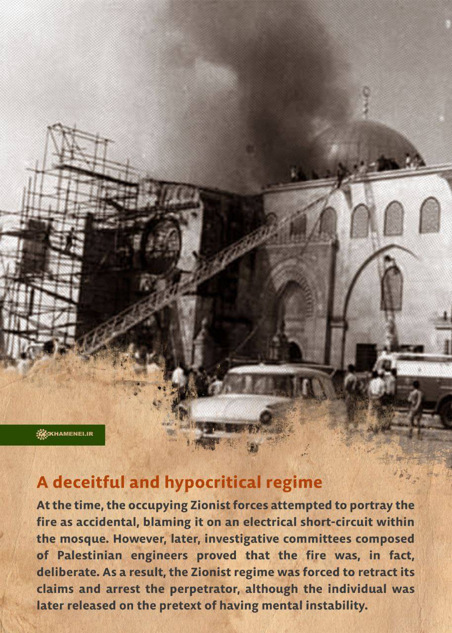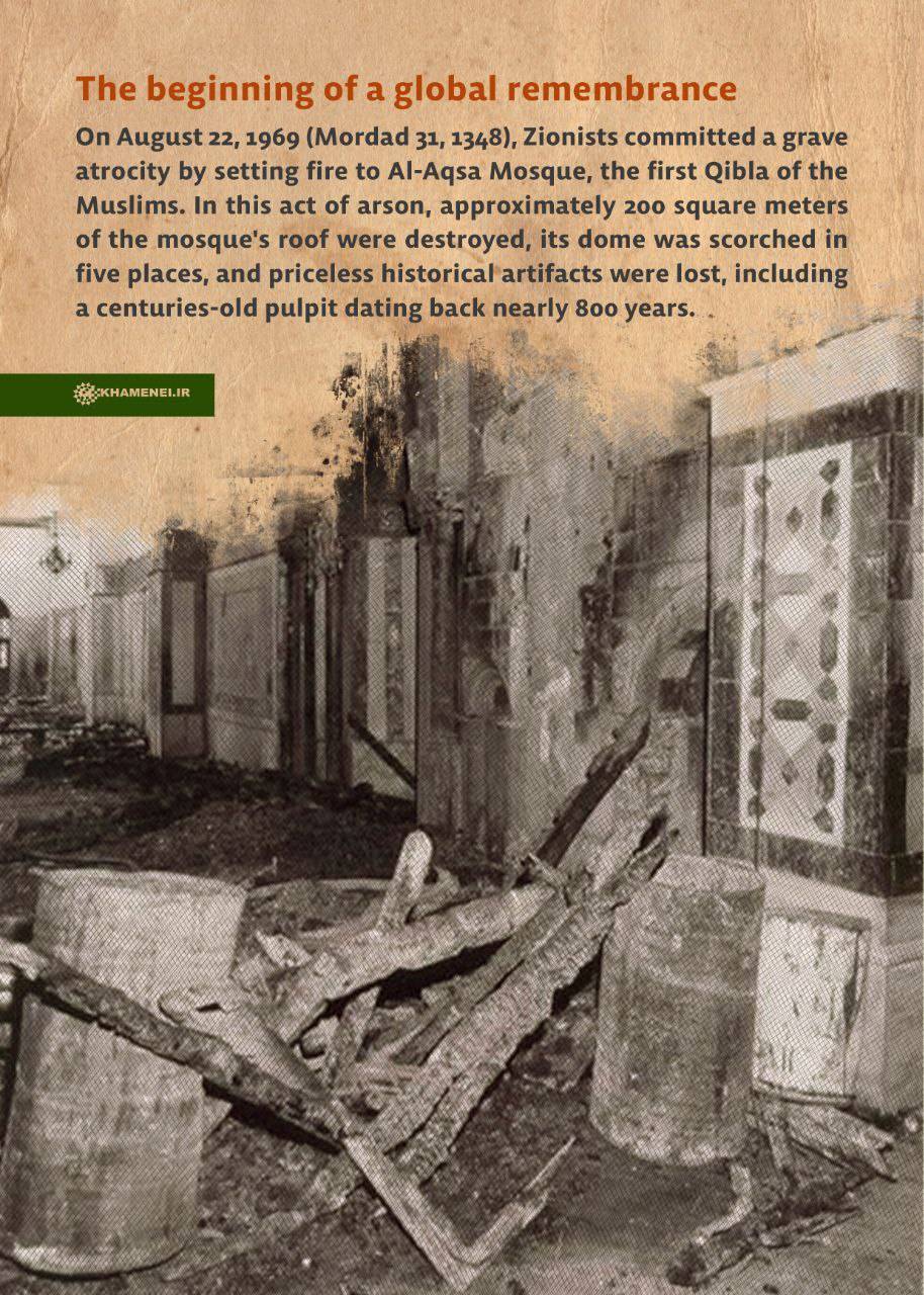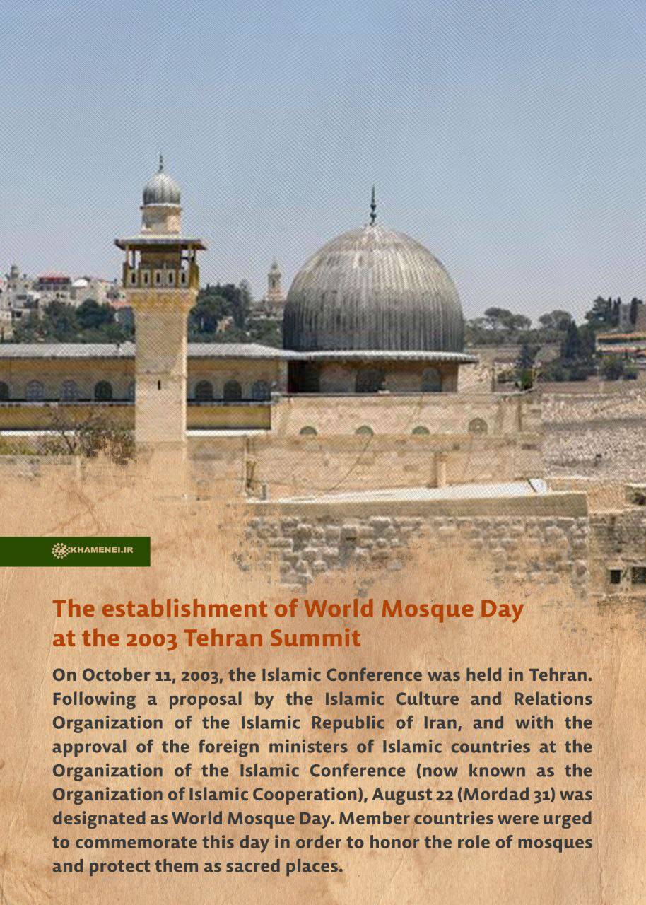 On August 22, 1969, Zionists set fire to Al-Aqsa Mosque, one of the holiest mosques for Muslims. In 2003, and by Islamic Republic of Iran's proposal, this day was designated as World Mosque Day and is commemorated annually in the Muslim world.
