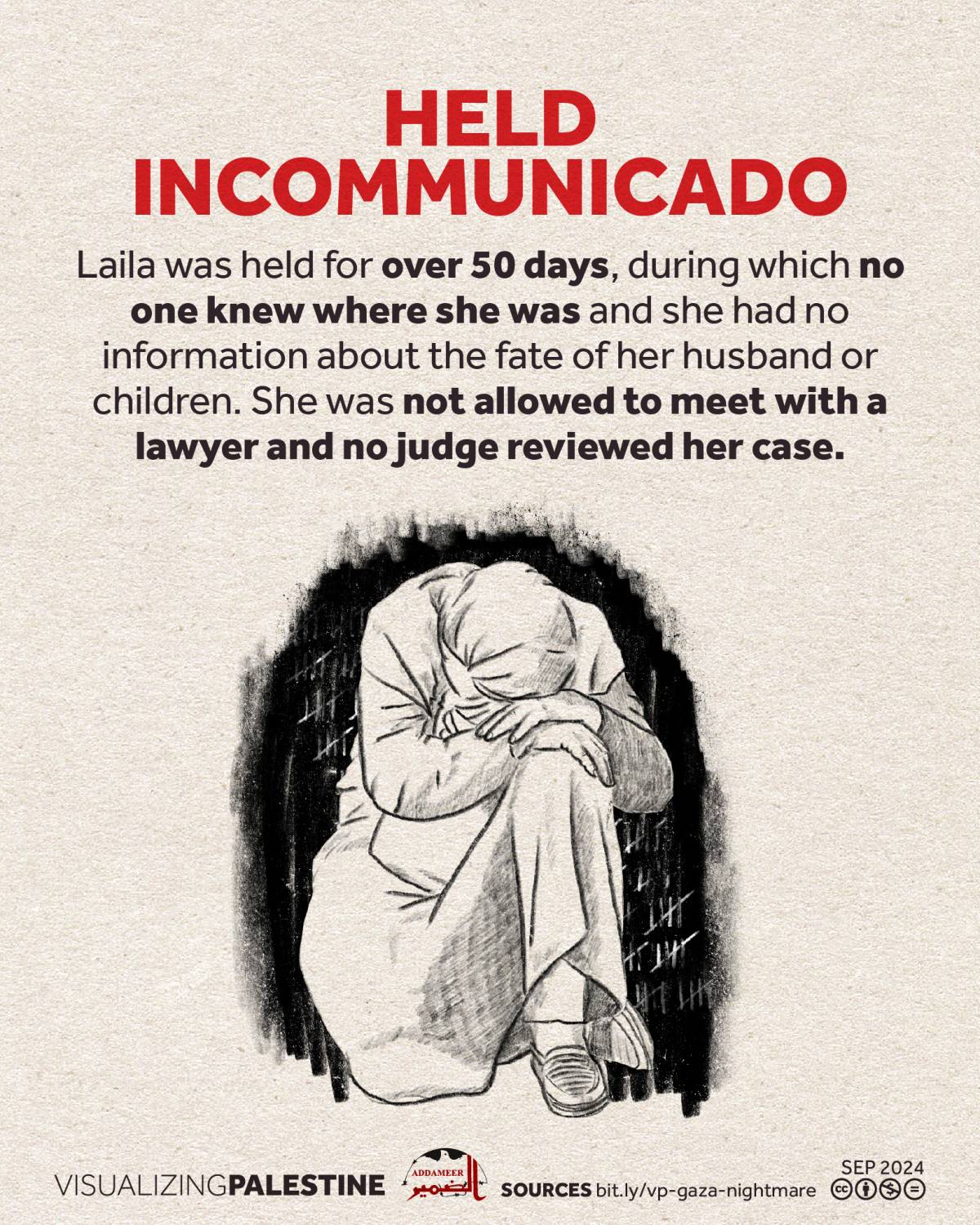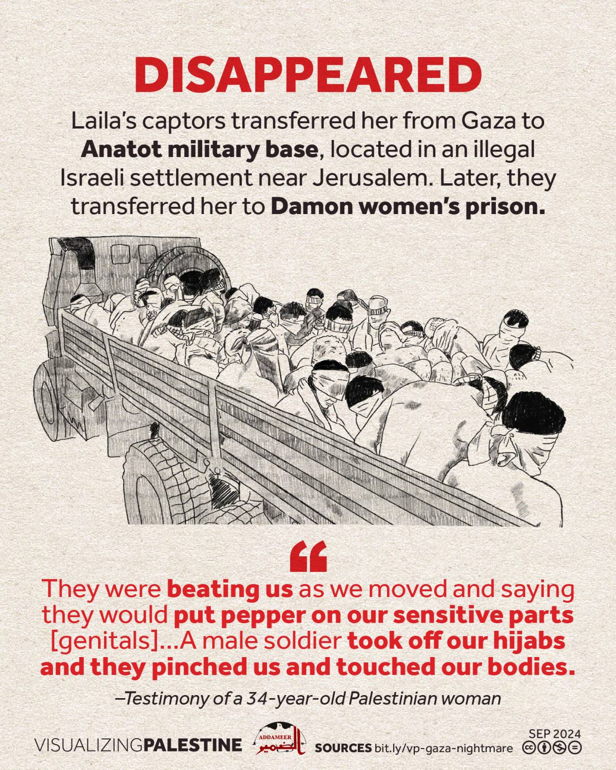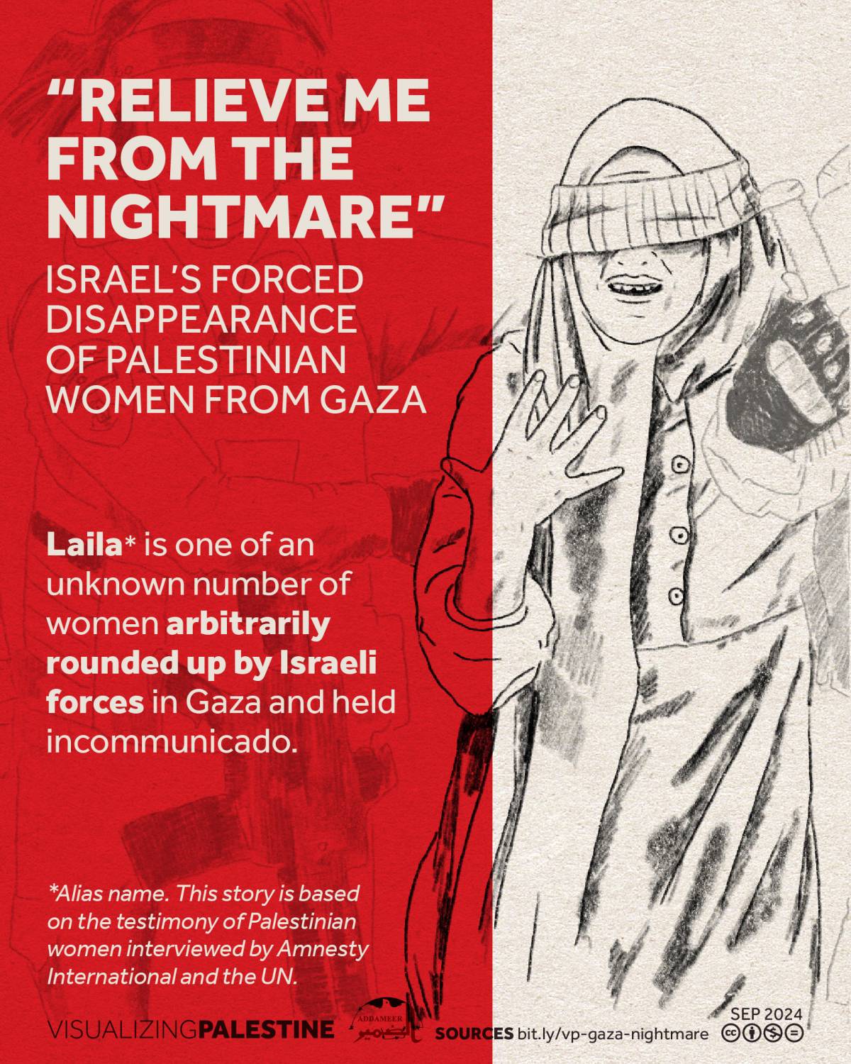 Our latest visual captures the horrific testimonies of Palestinian women from Gaza who were arbitrarily detained and held incommunicado by Israel for more than 50 days, according to interviews by Amnesty International and the UN. Held hostage under the “Detention of Unlawful Combatants law,” which grants the Israeli military sweeping powers to detain anyone from Gaza without evidence, Palestinians detained from Gaza are being subjected to torture and inhumane treatment, denied access to lawyers, while their location is kept secret from their families.