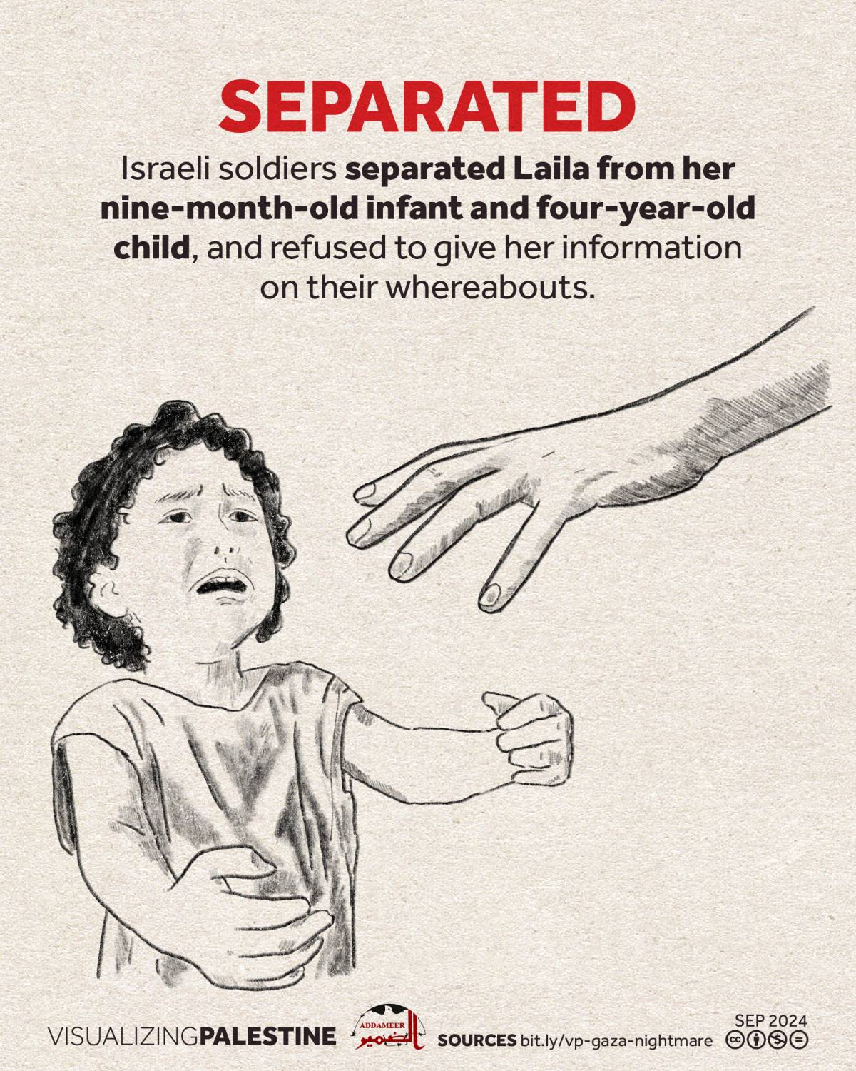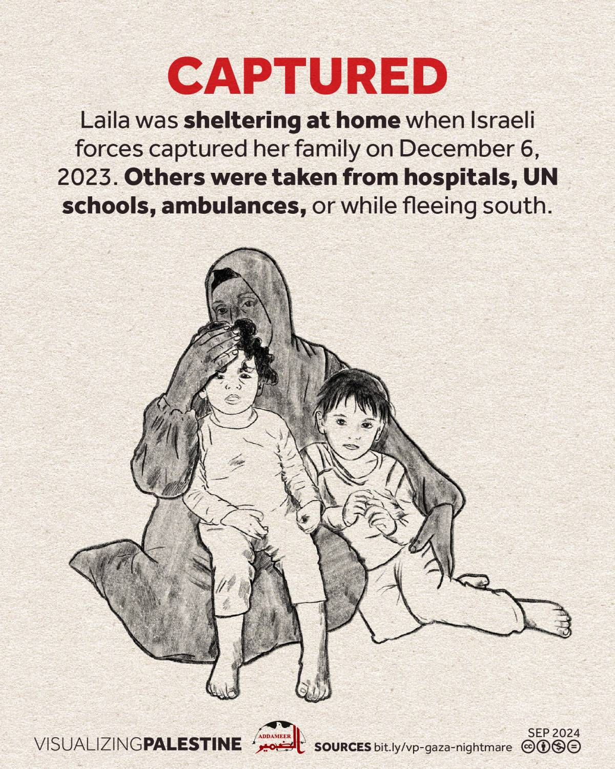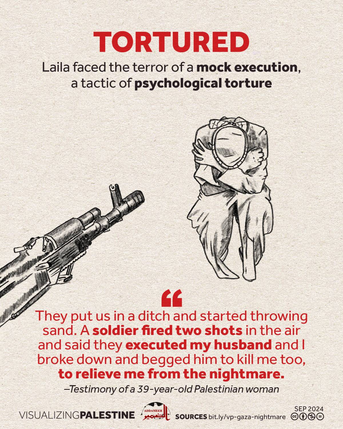 Our latest visual captures the horrific testimonies of Palestinian women from Gaza who were arbitrarily detained and held incommunicado by Israel for more than 50 days, according to interviews by Amnesty International and the UN. Held hostage under the “Detention of Unlawful Combatants law,” which grants the Israeli military sweeping powers to detain anyone from Gaza without evidence, Palestinians detained from Gaza are being subjected to torture and inhumane treatment, denied access to lawyers, while their location is kept secret from their families.