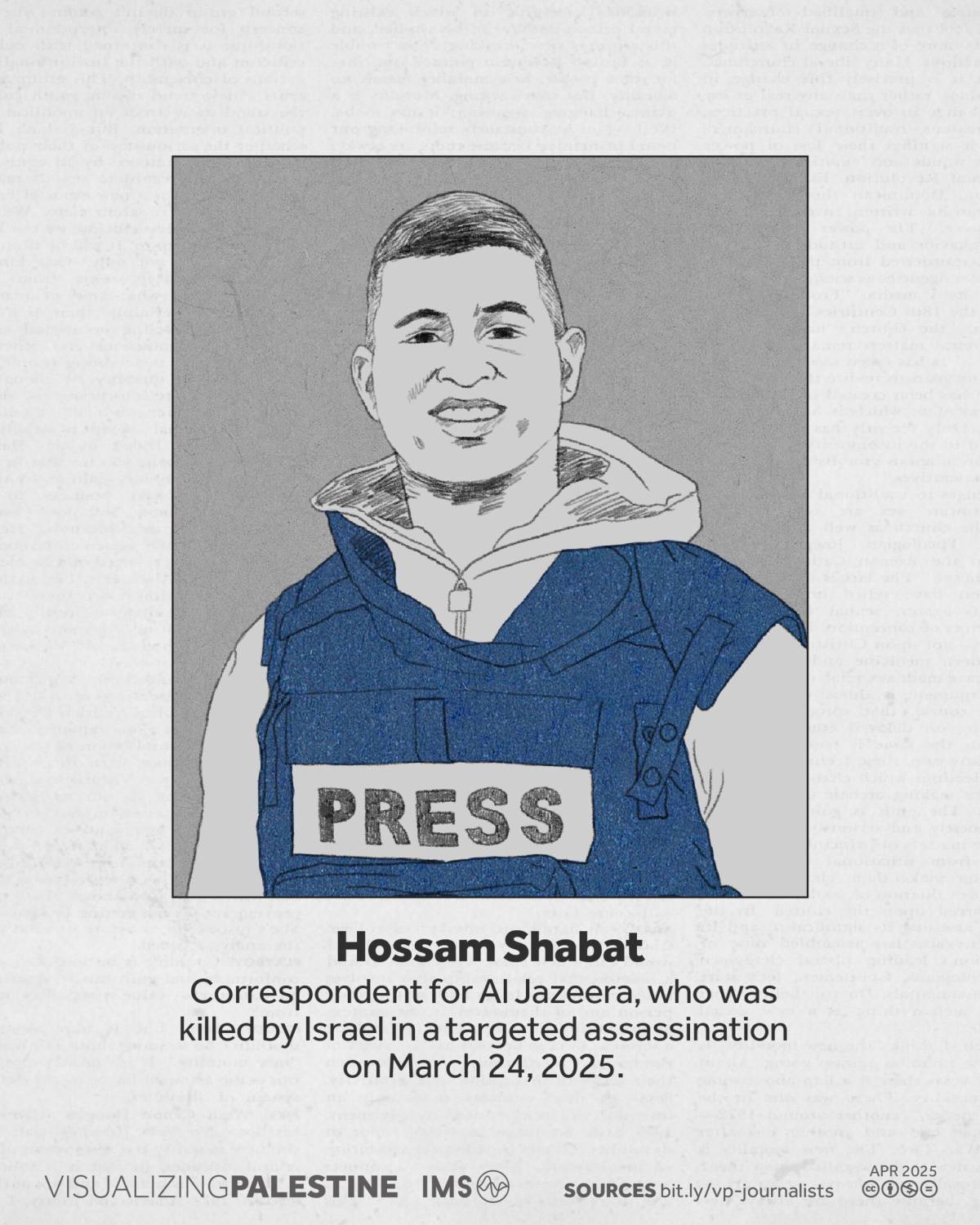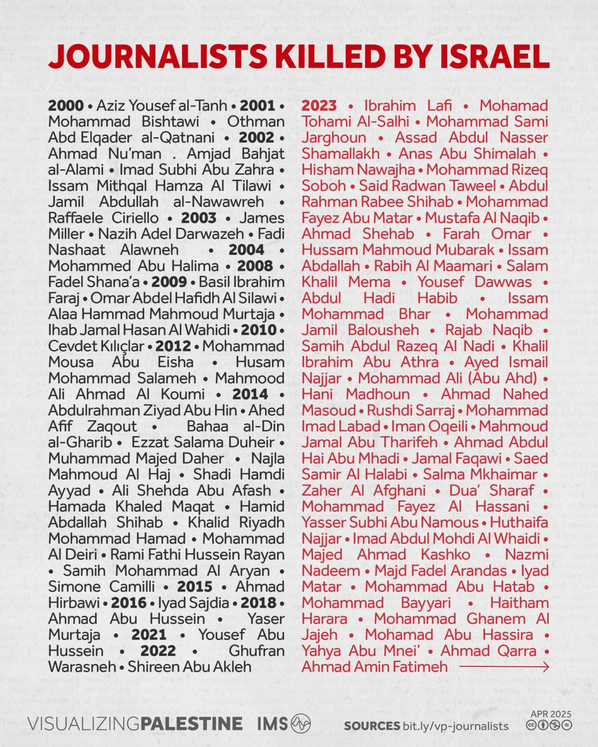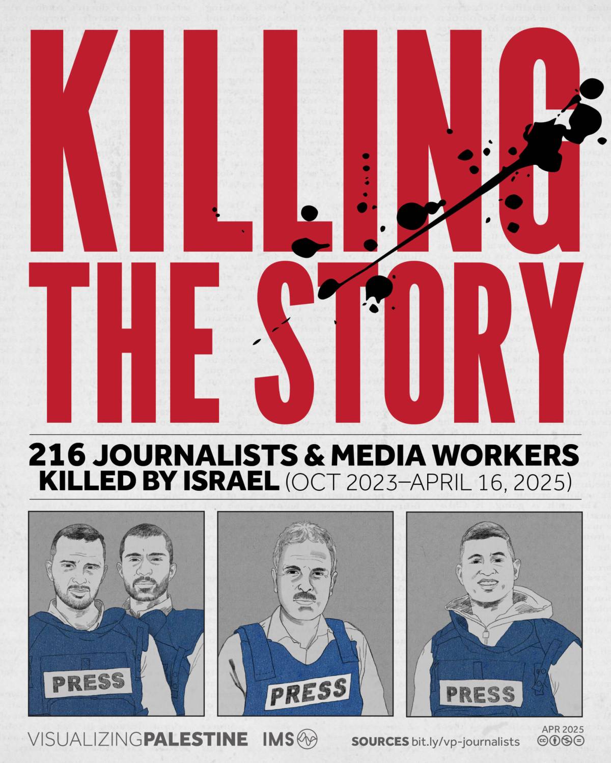 [April, 2025]. In this fourth update of the visual “Killing the Story”, we honor the hundreds of Palestinian journalists killed by Israel. These journalists documented atrocities as they unfolded — voices that the Israeli regime systematically continues to silence.