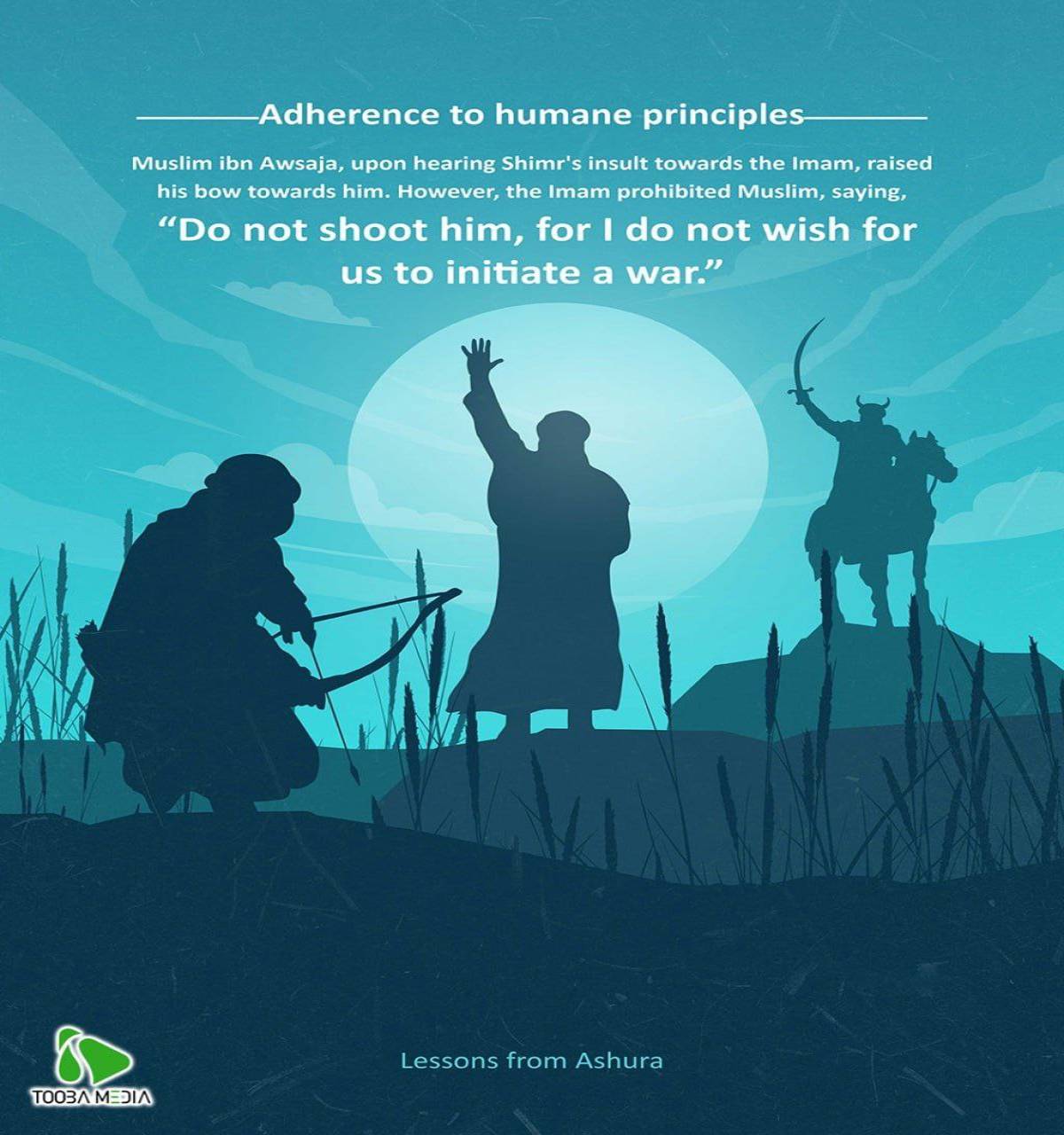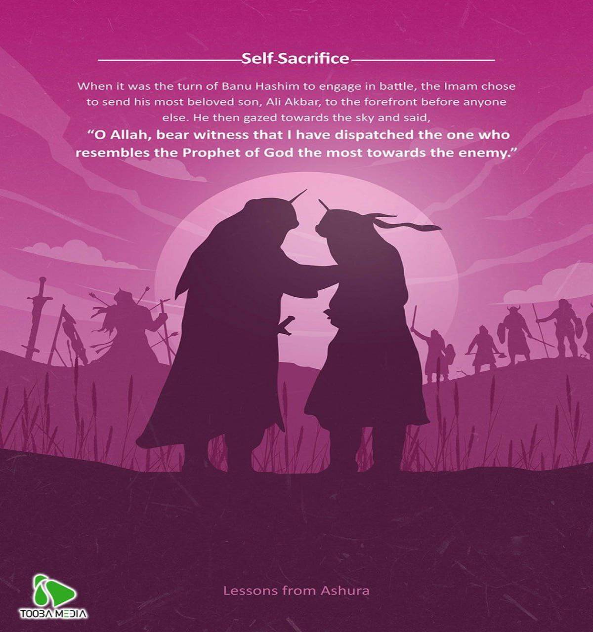 Lessons from AshuraSelf- Sacrificewhen it was the turn of Banu Hashim to engage in battle, the lmam chose to send his most beloved son, Ali Akbar, to the forefront before anyone else.He then gazed towards the sky and said, "O Allah, bear witness that l have dispatched the one who resembles the Prophet of God the most towards the enemy."