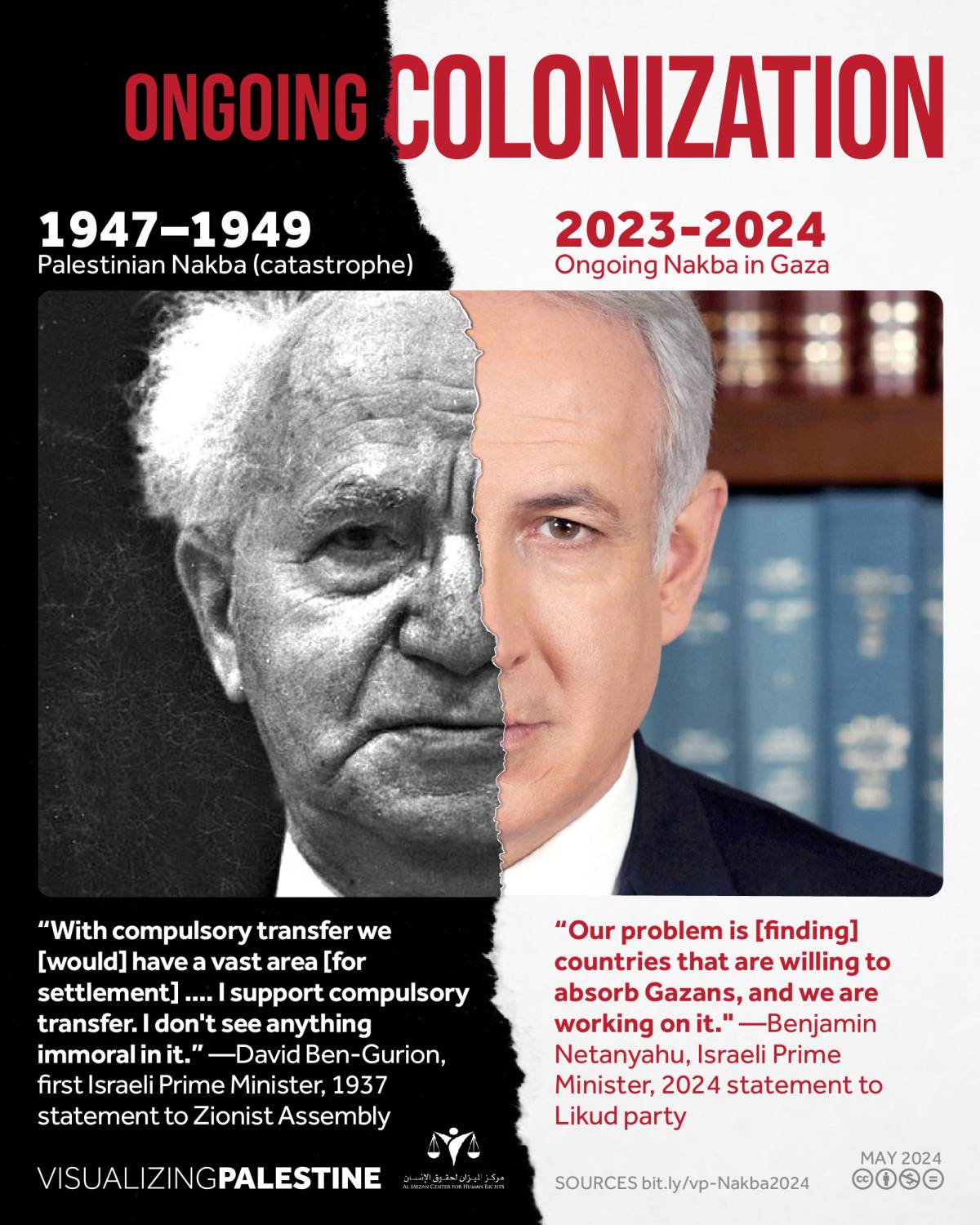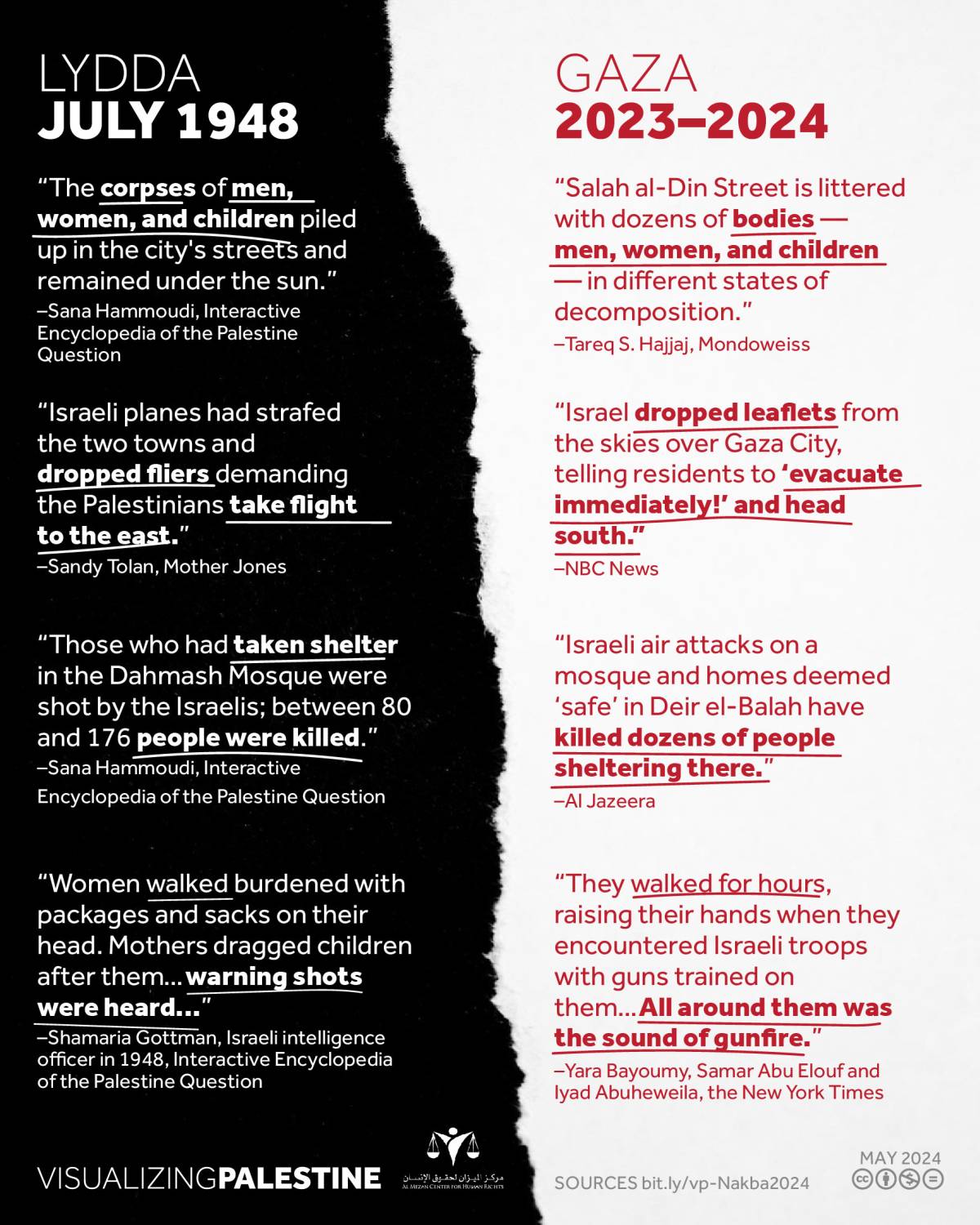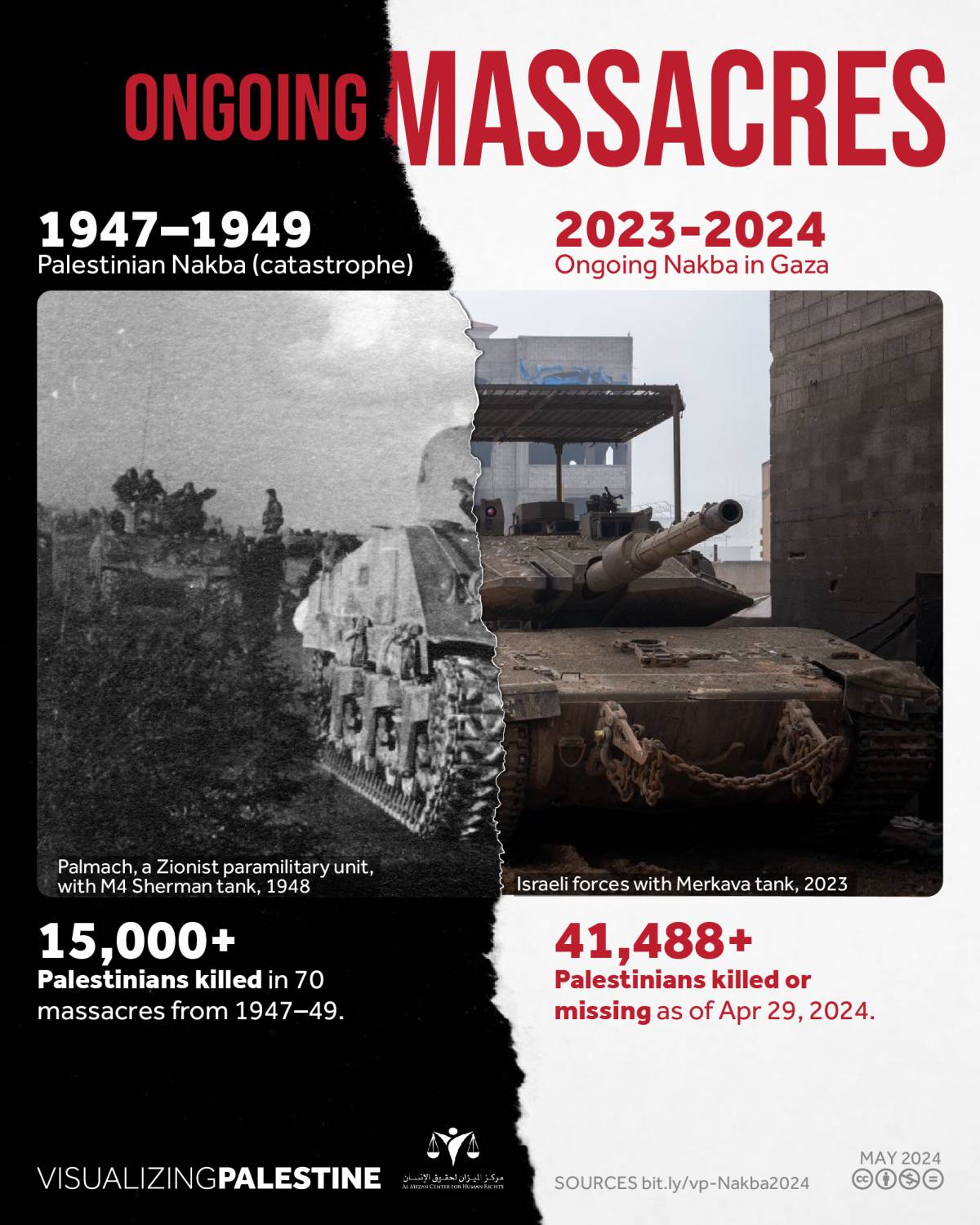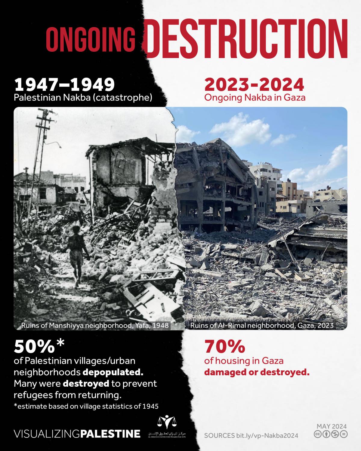 On May 15, 2024, we will commemorate the 76th anniversary of the Nakba amid another catastrophe. Since 1948, Palestinians have suffered a profound and enduring trauma, as families were forcibly uprooted from their ancestral lands by Zionist militias, villages were destroyed, and communities were torn apart to create the settler colonial state of Israel. The Nakba represents not only a historical event but an ongoing reality, as it laid the foundation for the continued colonization and occupation of Palestinian land and violent dispossession of the Palestinian people. This series captures how the genocide and mass displacement of Palestinians in Gaza is an extension of the 1948 Nakba.