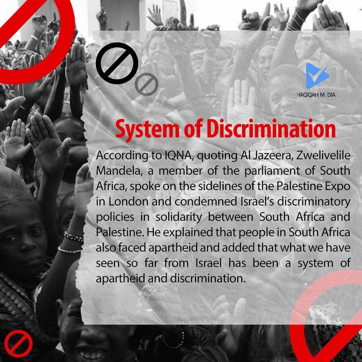 According to IQNA, quoting AI Jazeera, Zwelivelile Mandela, a member of the parliament of South Africa spoke on the sidelines of the Palestine EXPO in London and condemned Israel's discriminatory policies in solidarity between South Africa and Palestine. He explained that people in South Africa also faced apartheid and added that what we have seen so far from lsrael has been a system of apartheid and discrimination.