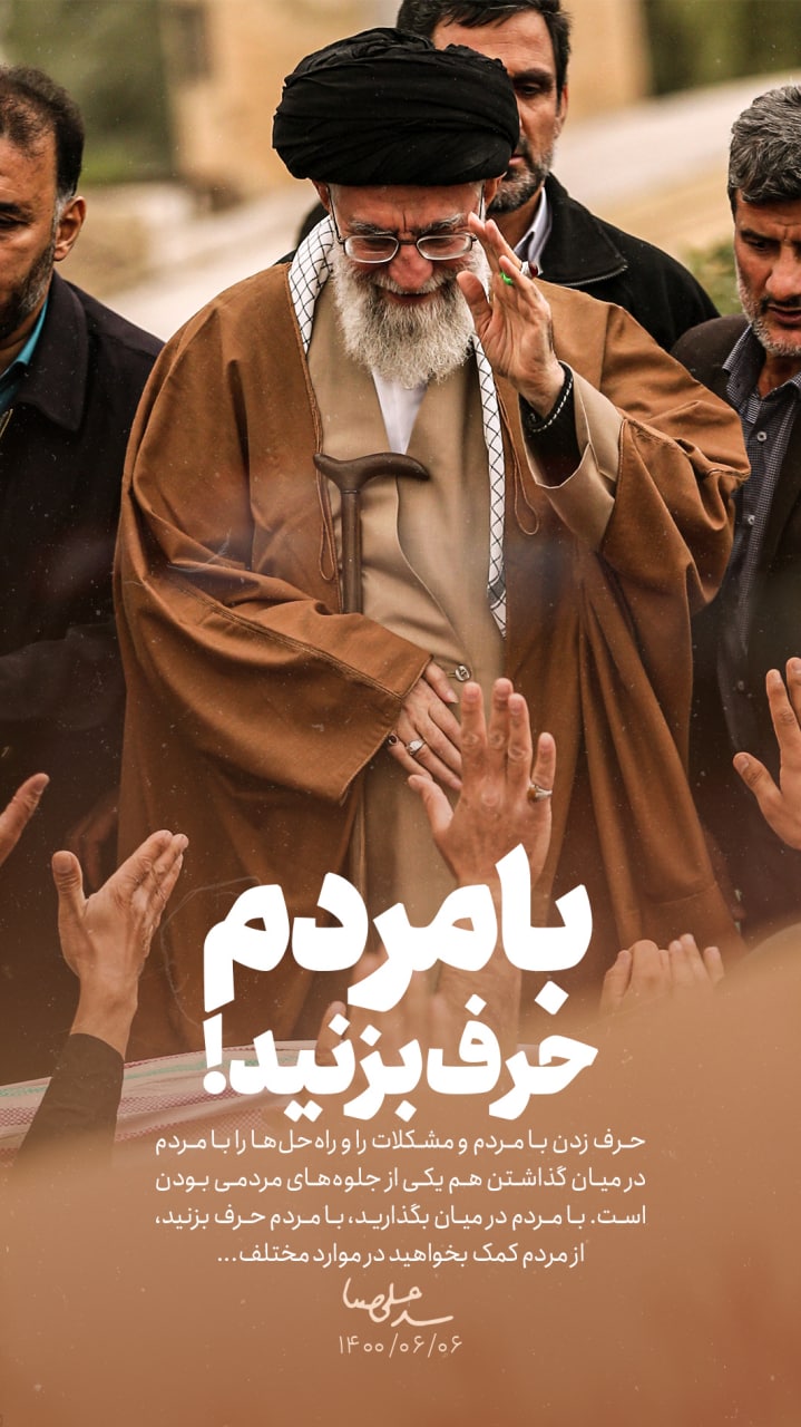 حرف زدن با مردم و مشکلات را و راهحلها را با مردم در میان گذاشتن هم یکی از جلوههای مردمی بودن است. با مردم در میان بگذارید، با مردم حرف بزنید، از مردم کمک بخواهید در موارد مختلف...رهبر انقلاب|1400/6/6