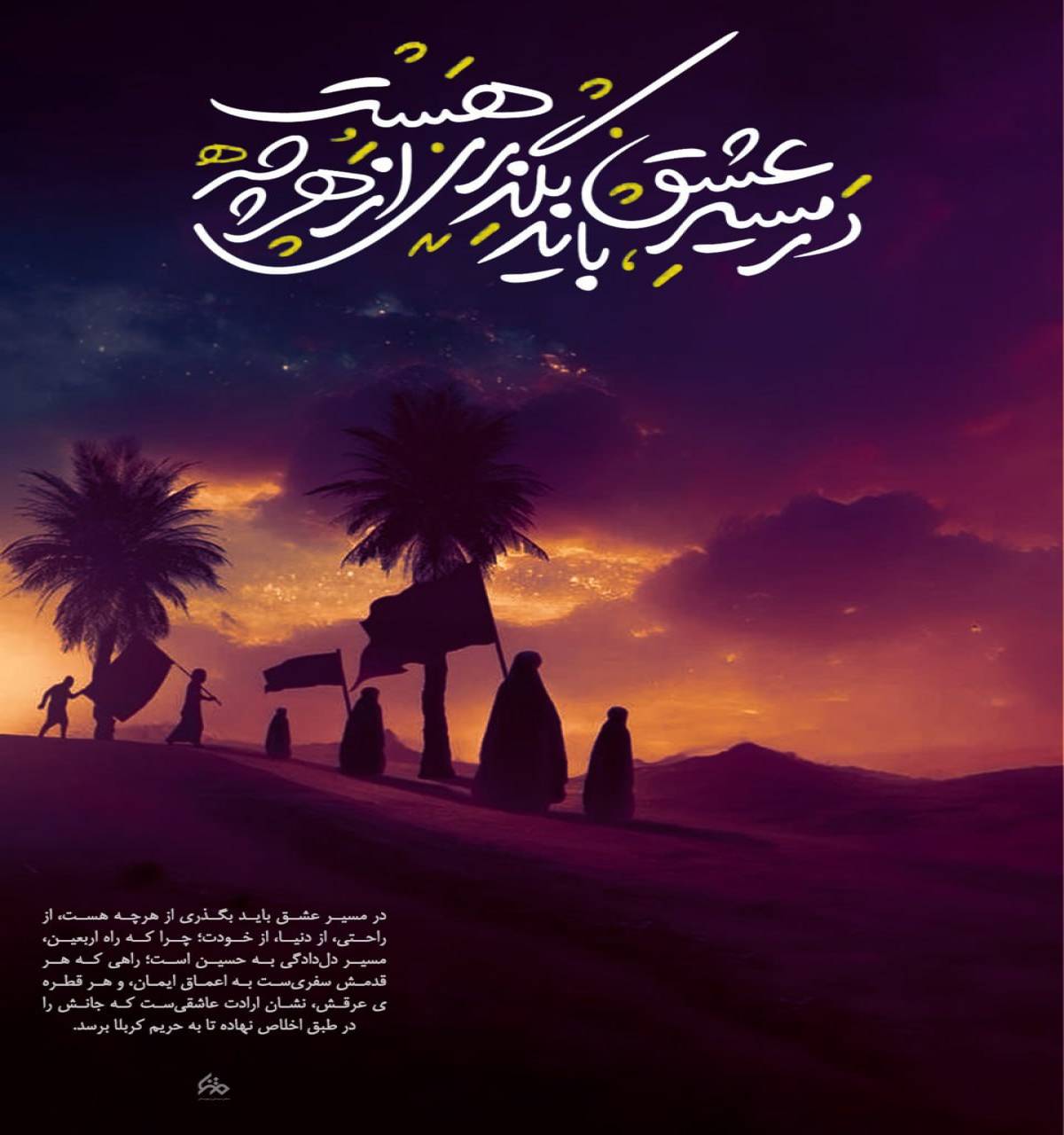 در مسیر عشق باید بگذری از هرچه هست از راحتی از دنیا از خودت؛ چرا که راه اربعین مسیر دلدادگی به حسین است؛ راهی که هر قدمش سفریست به اعماق ایمان و هر قطره ی ،عرقش نشان ارادت عاشقیست که جانش را در طبق اخلاص نهاده تا به حریم کربلا برسد.