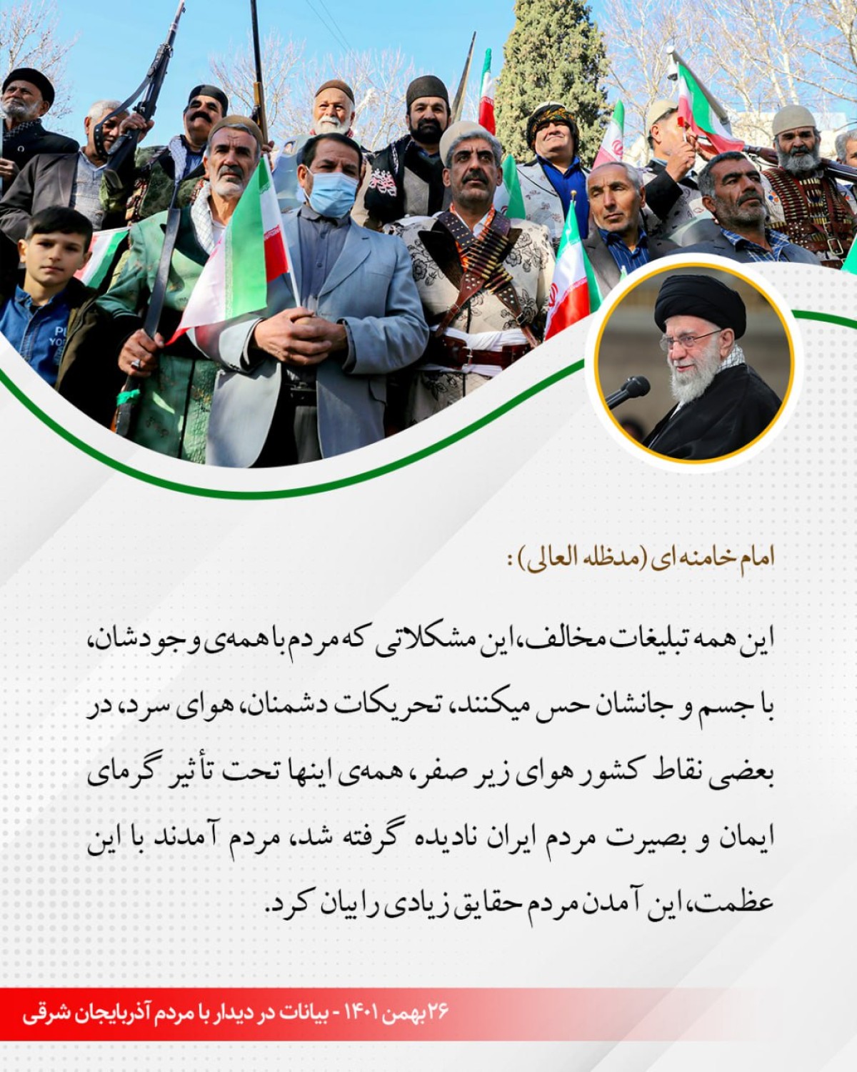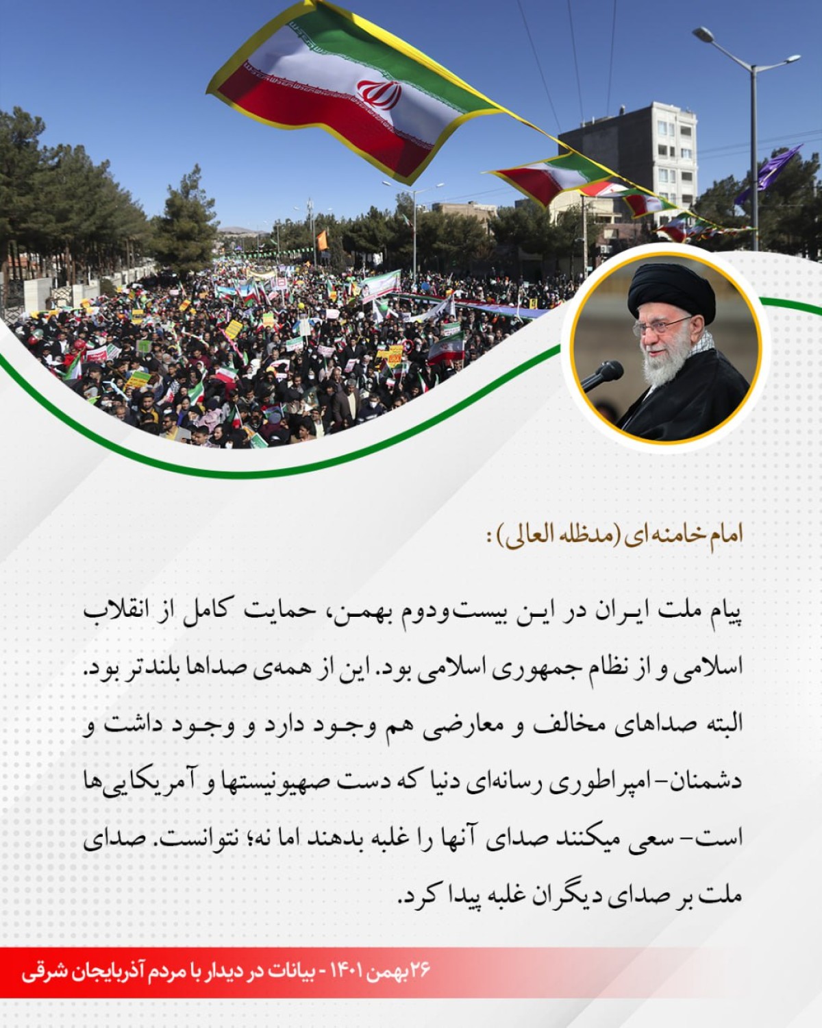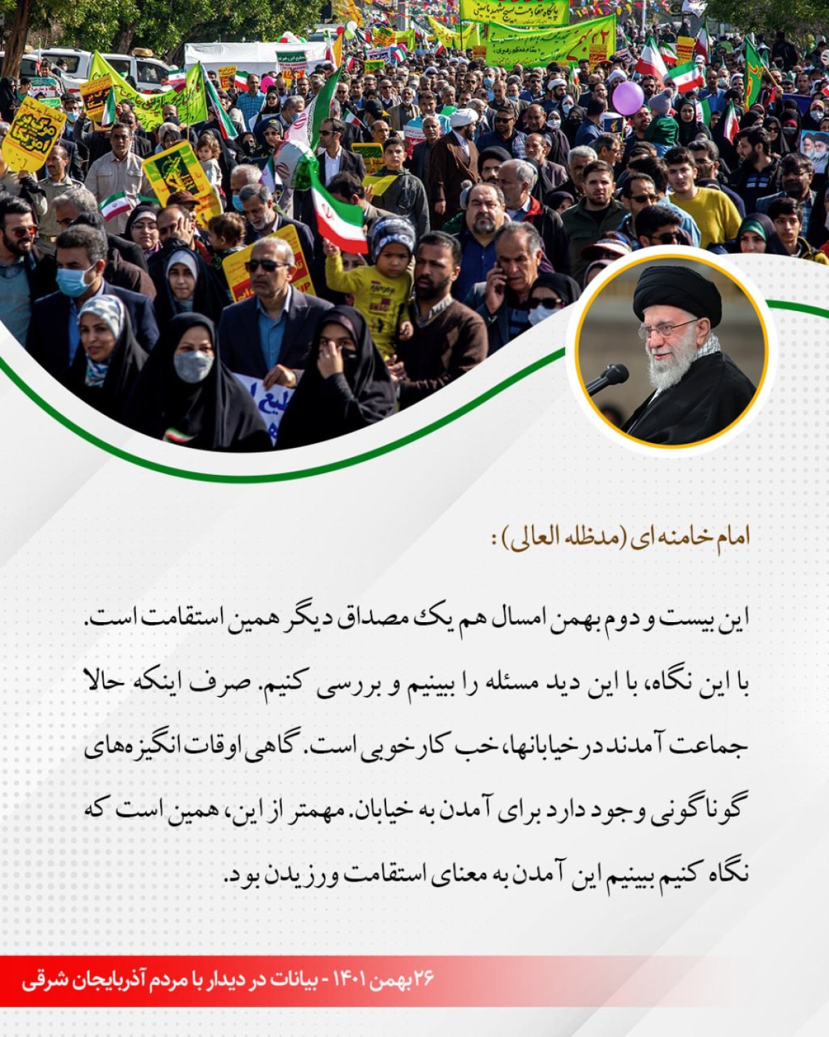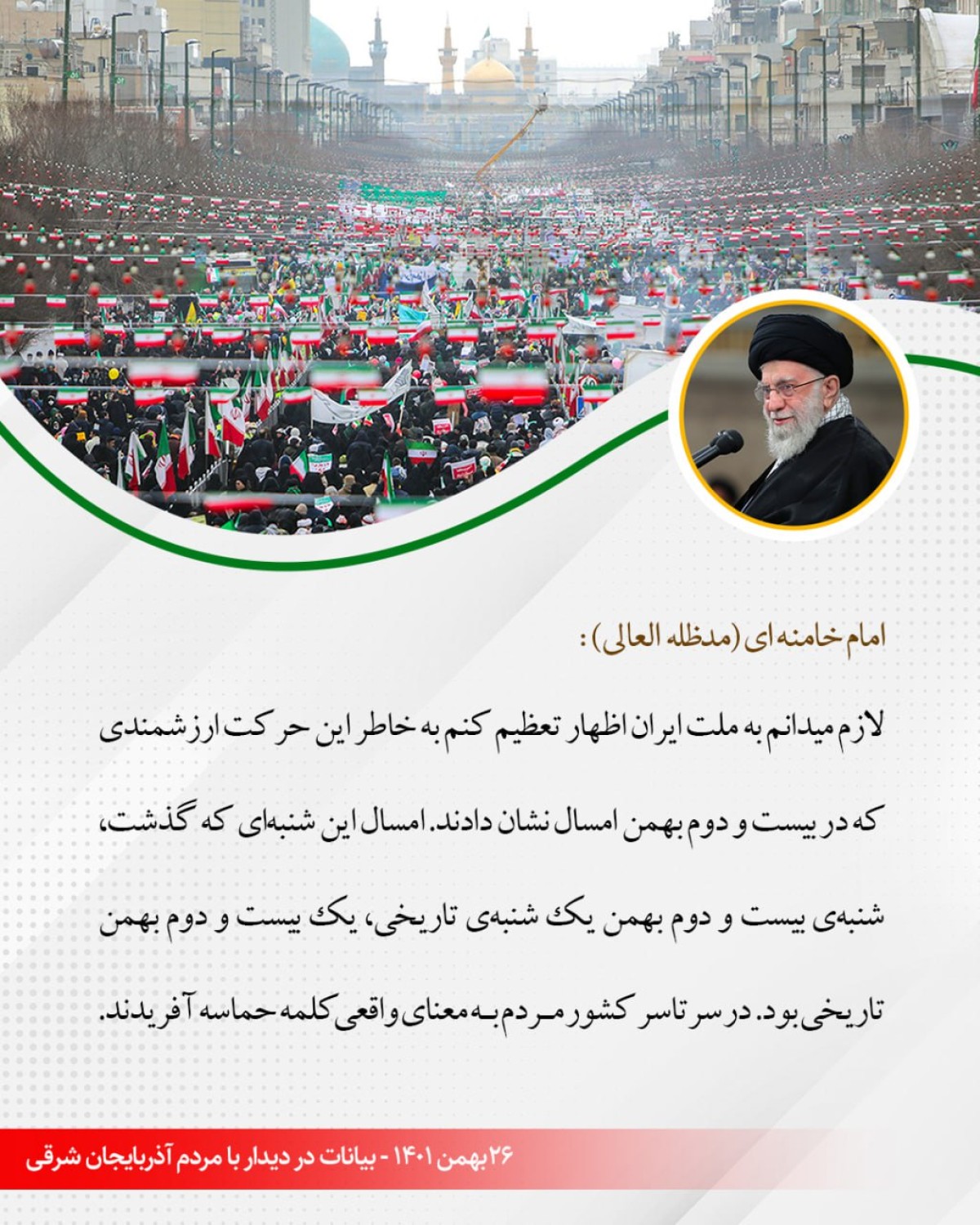اظهار ارادت به ملت ایران در همه جا؛ از منتها الیه شرق کشور تا منتها الیه غرب کشور، از شمال تا جنوب کشور، در شهرهای دوردست، در مراکز، در شهرهای بزرگ مثل تبریز، اصفهان، مشهد و جاهای دیگر تا روستاها؛ همه با هم صدا بلند کردند ملت ایران، خیلی ارزشمند است اینها. شکراللّه سعیکم ملت ایران! البته بنده حالا خودم را شایستهی این نمیدانم که من تشکر کنم، خدا باید تشکر کند.