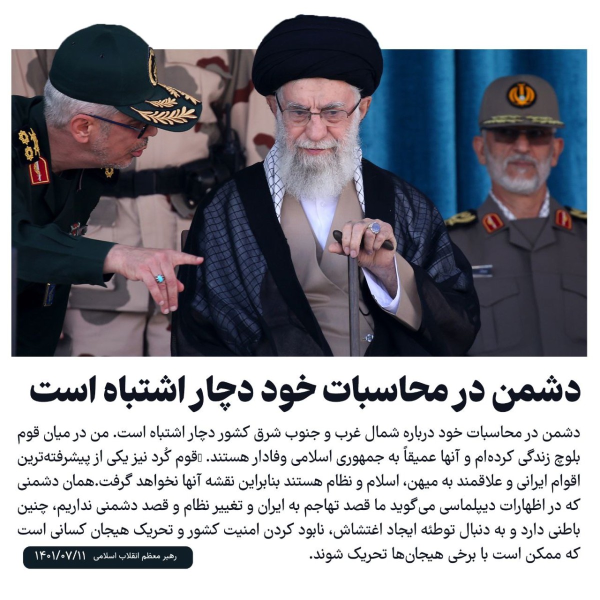 دشمن در محاسبات خود درباره شمال غرب و جنوب شرق کشور دچار اشتباه است. من در میان قوم بلوچ زندگی کرده ام و آنها عمیقا به جمهوری اسلامی وفادار هستند. اقوم گرد نیز یکی از پیشرفته ترین اقوام ایرانی و علاقمند به میهن، اسلام و نظام هستند بنابراین نقشه آنها نخواهد گرفت.همان دشمنی که در اظهارات دیپلماسی می گوید ما قصد تهاجم به ایران و تغيير نظام و قصد دشمنی نداریم، چنین باطنی دارد و به دنبال توطئه ایجاد اغتشاش، نابود کردن امنیت کشور و تحریک هیجان کسانی است که ممکن است با برخی هیجانها تحریک شوند.