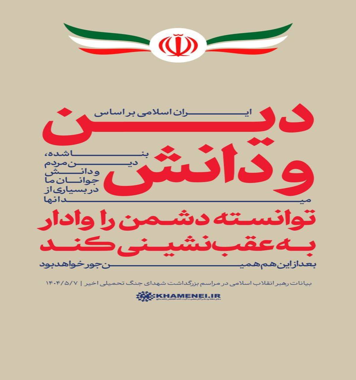 رهبر انقلاب، صبح امروز: ایران اسلامی بر اساس دین و دانش بنا شده، دین مردم و دانش جوانان ما در بسیاری از میدانها توانسته دشمن را وادار به عقبنشینی کند