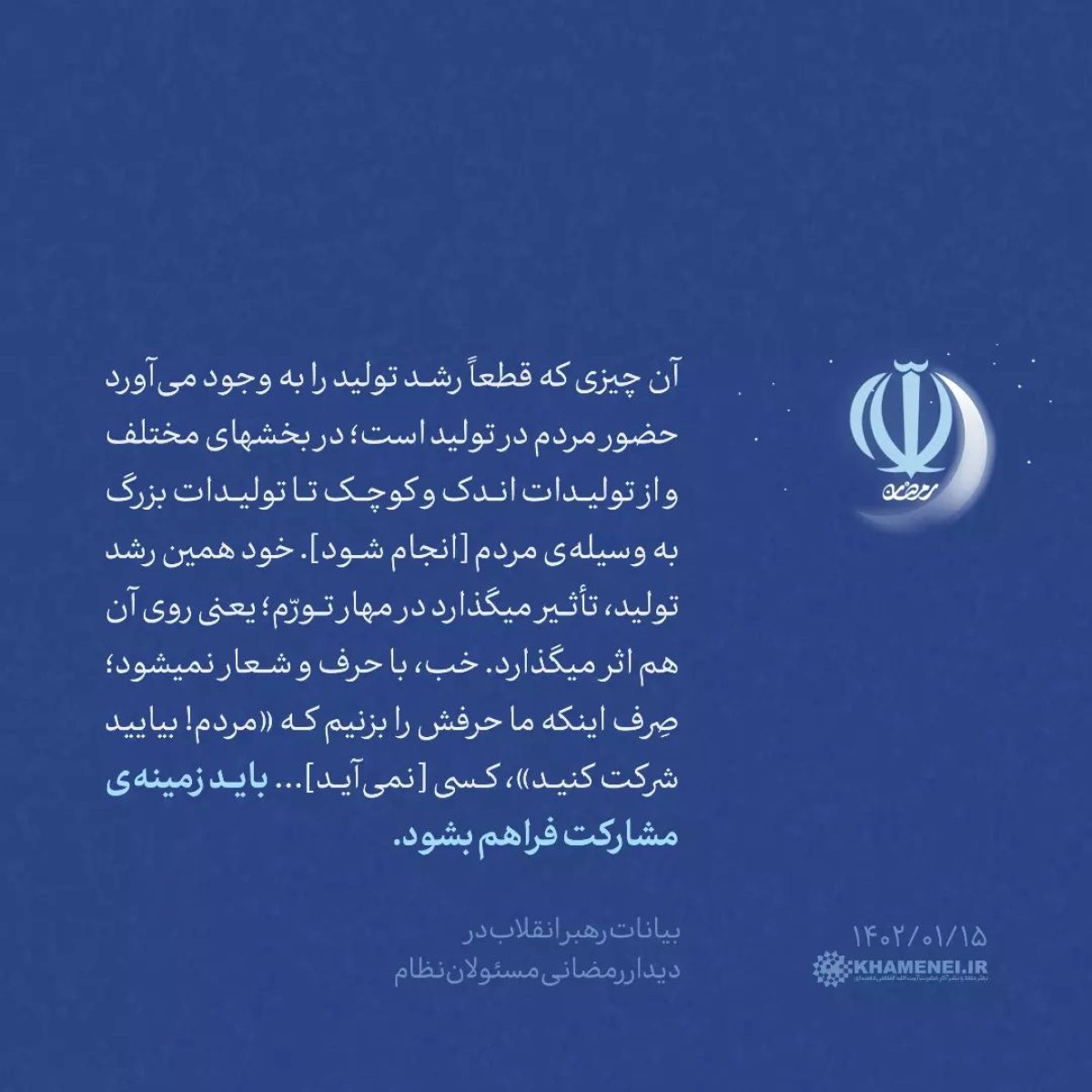 آن چیزی که قطعاً رشد تولید را به وجود می آورد حضور مردم در تولید است؛ در بخشهای مختلف و از تولیدات اندک و کوچک تا تولیدات بزرگ به وسیله ی مردم [ انجام شود. خود همین رشد تولید، تأثیر میگذارد در مهار تورم ؛ یعنی روی آن هم اثر میگذارد. خب با حرف و شعار نمیشود؛ صرف اینکه ما حرفش را بزنیم که مردم بیایید شرکت کنید، کسی نمی آید... باید زمینه ی مشارکت فراهم بشود