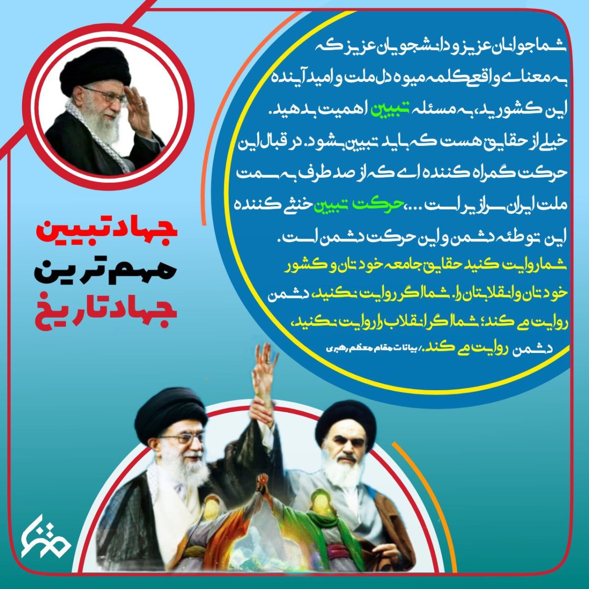 شماجوانان عزيزودانشجويان عزيزكہ به معناے واقعی كلمہ میوہ دل ملت وامید آینده اين كشوريد، یہ مسئلہ تبیین اهمیت بدهید. خیلی از حقايق هست که باید تبیین شود. در قبال این حركت گمراه کننده اے كہ از صد طرف بہ سمت ملت ایران سرازير است...» حركت تبیین خنثی كننده این توطئه دشمن واين حركت دشمن است. شما روایت کنید حقایق جامعہ خودتان وکشور خودتان وانقلابتان را. شما اگرروایت نكنید دشمن روایت مے کند؛ شما اگرانقلاب را روایت نكنید،دشمن روایت می کند
