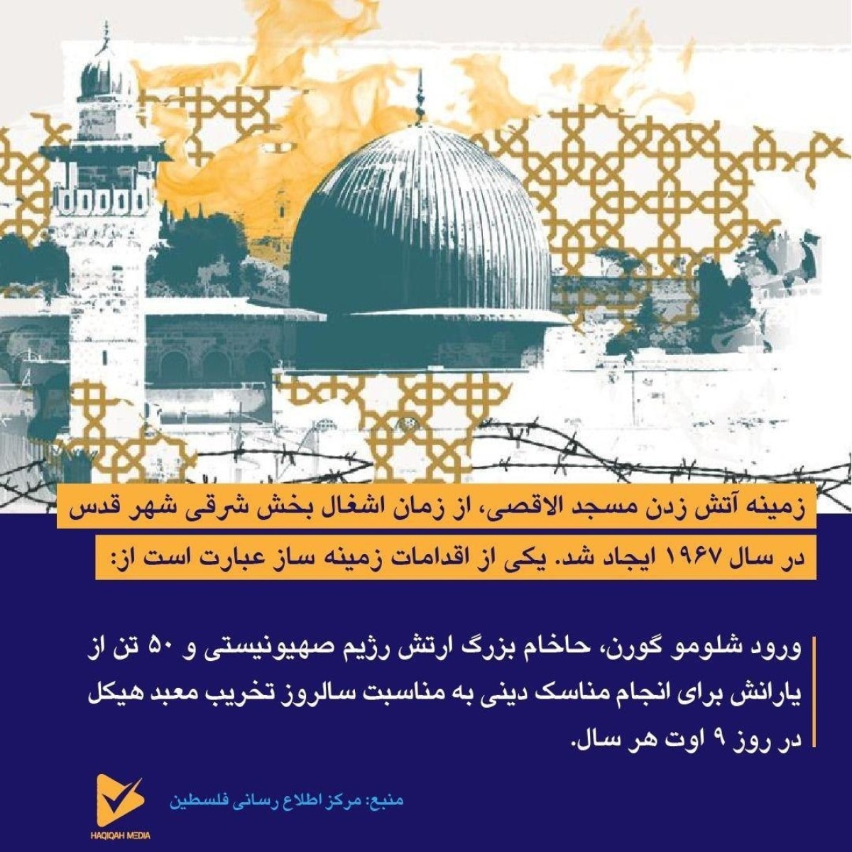 - ورود ژنرال مردخای جور، فرمانده تیپ چتربازان ارتش رژیم صهیونیستی به همراه سربازانش به مسجد الاقصی در جنگ سال 1967 و افراشتن پرچم "اسرائیل" در قبة الصخرة، سوزندان قرآنها جلوگیری از ورود نمازگزارن به مسجد الاقصی و مصادره کلیدهای آن.