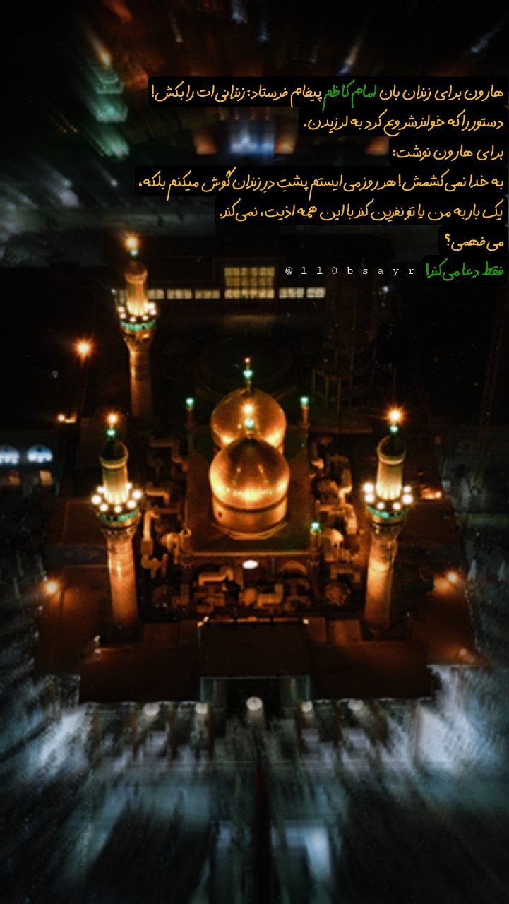 هارون برای زندان بان امام_کاظم پیغام فرستاد: "زندانیات را بکش!" دستور را که خواند شروع کرد به لرزیدن. برای هارون نوشت: "به خدا نمیکشمش! هر روز میایستم پشتِ درِ زندان گوش میکنم بلکه، یک بار به من یا تو نفرین کند با این همه اذیت، نمیکند. میفهمی؟ فقط دعا میکند!