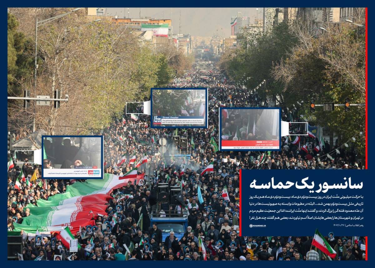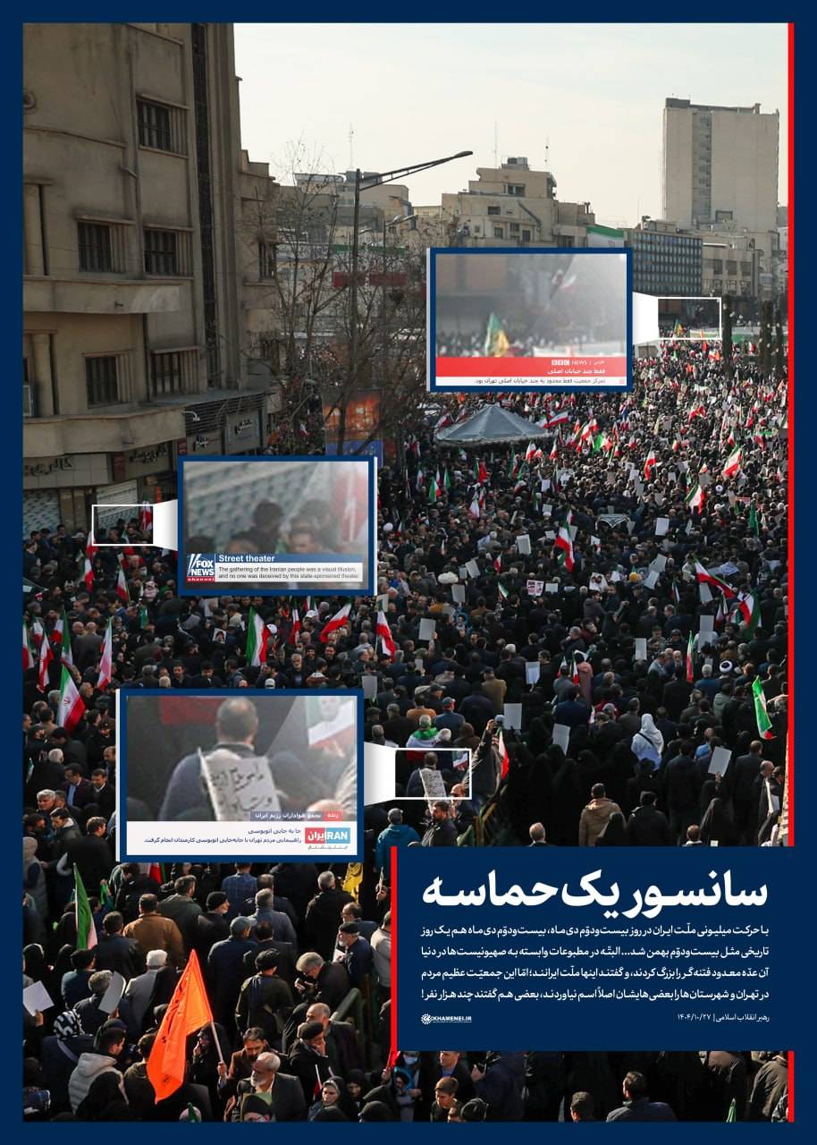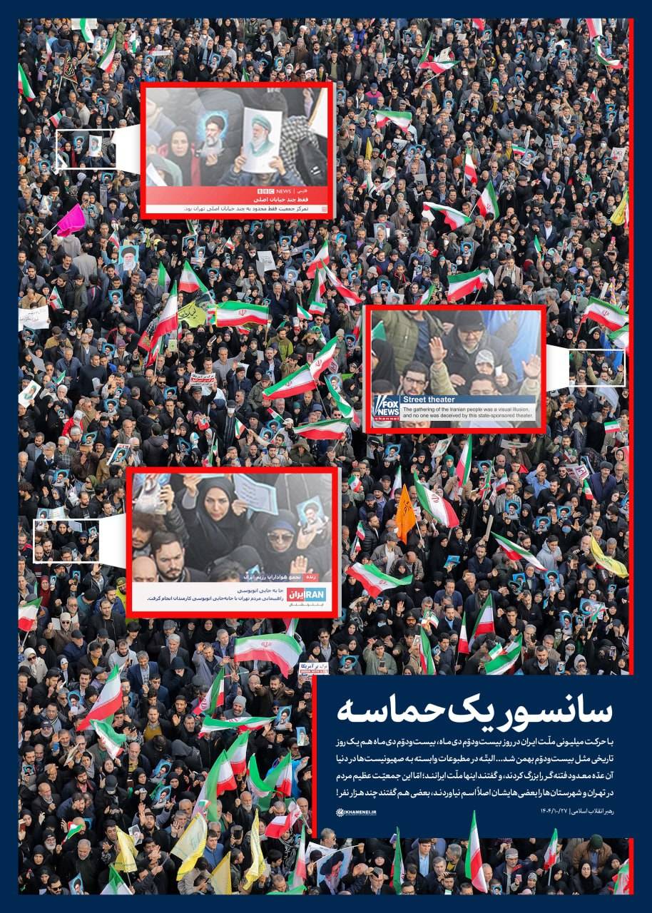 حضرت آیتالله خامنهای: با حرکت میلیونی ملّت ایران در روز بیست و دوّم دی ماه، بیست و دوّم دی ماه هم یک روز تاریخی مثل بیست و دوّم بهمن شد... البته در مطبوعات وابسته به صهیونیستها در دنیا آن عده معدود فتنهگر را بزرگ کردند، و گفتند اینها ملت ایرانند؛ امّا این جمعیّت عظیم مردم در تهران و شهرستانها را بعضیهایشان اصلا اسم نیاوردند، بعضی هم گفتند چند هزار نفر! ۱۴۰۴/۱۰/۲۷
