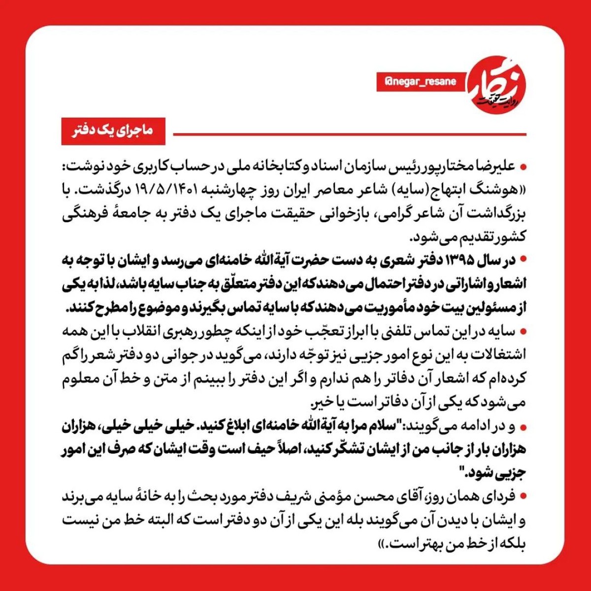 در سال ۱۳۹۵ دفتر شعری به دست حضرت آیةالله خامنهای میرسد و ایشان با توجه به اشعار و اشاراتی در دفتر احتمال میدهند که این دفتر متعلّق به جناب سایه باشد، لذا به یکی از مسئولین بیت خود مأموریت میدهند که با سایه تماس بگیرند و موضوع را مطرح کنند.