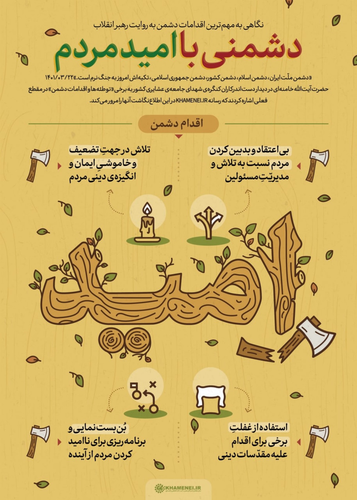 امروز بیشترین نقشه ی دشمنان، این است که ملت ایران این اعتماد به نفسی را که دارد از دست بدهد. تلاش مهم جنگ نرم دشمن، امروز متوجه این است که ملت ایران امیدش را از دست بدهد.