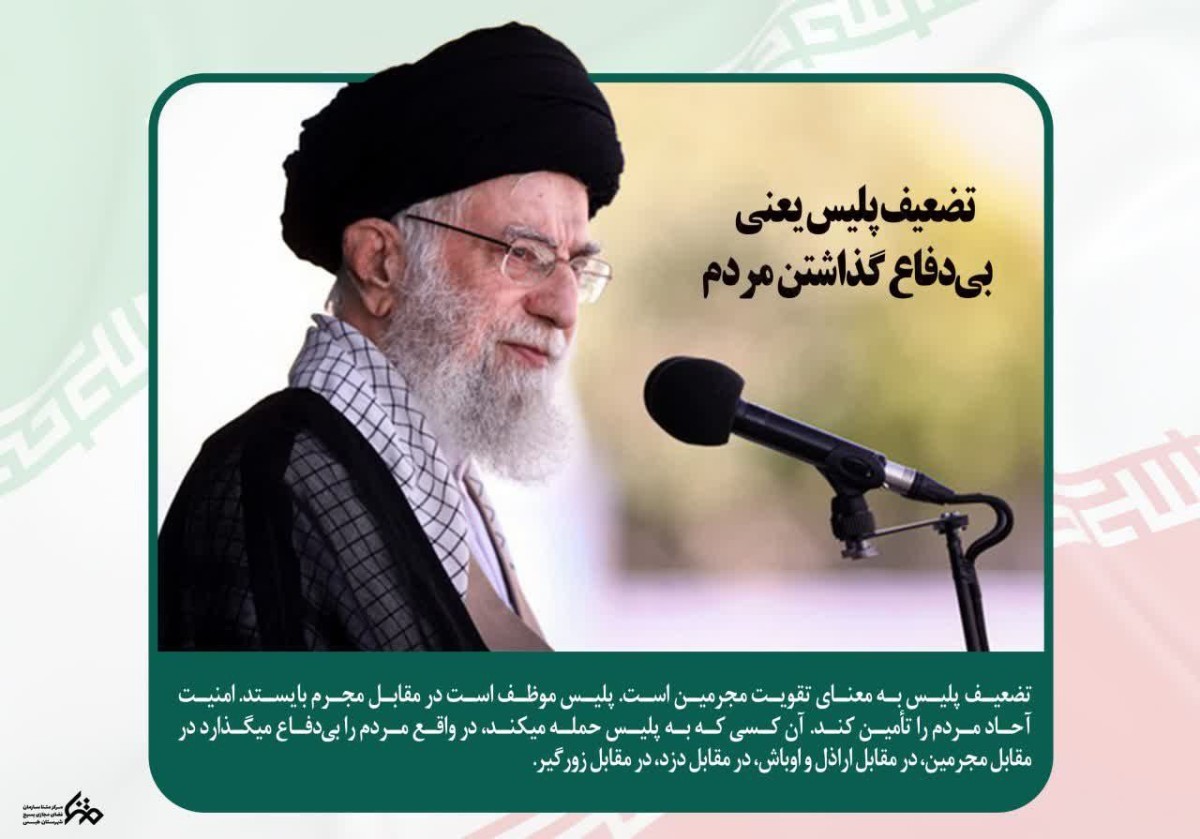 تضعیف پلیس یعنی بی دفاع گذاشتن مردم تضعیف پلیس به معنای تقویت مجرمین است. پلیس موظف است در مقابل مجرم بایستد. امنیت آحاد مردم را تأمین کند. آن کسی که به پلیس حمله میکند، در واقع مردم را بی دفاع میگذارد در مقابل مجرمین، در مقابل اراذل و اوباش، در مقابل دزد، در مقابل زورگیر.