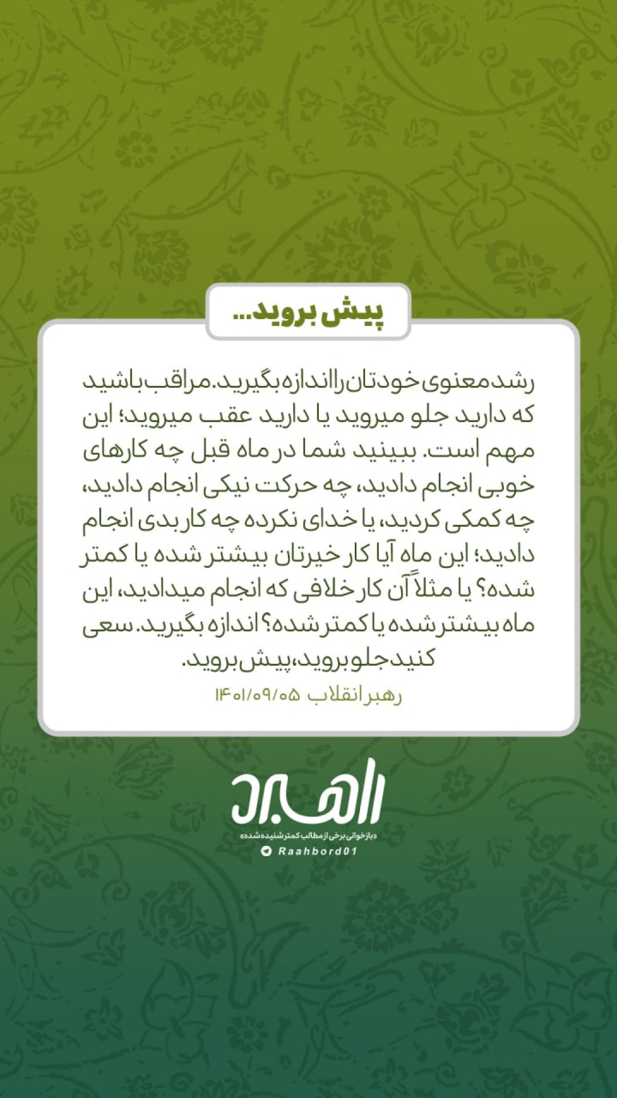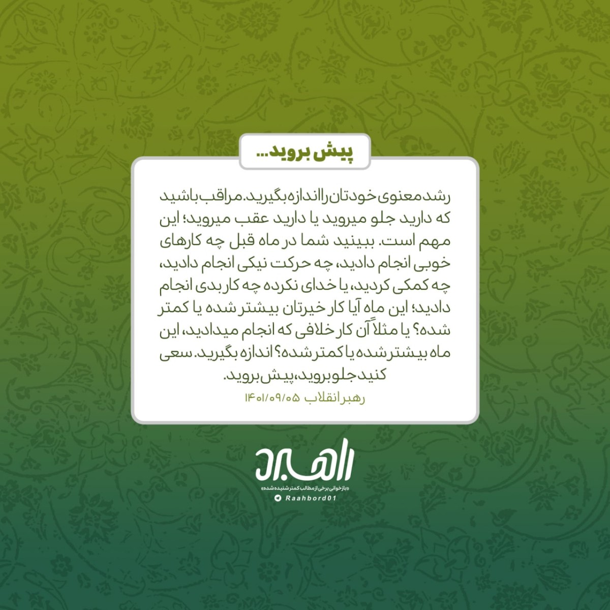 رشد معنوی خودتان را اندازه بگیرید. مراقب باشید که دارید جلو میروید یا دارید عقب میروید؛ این مهم است. ببینید شما در ماه قبل چه کارهای خوبی انجام دادید، چه حرکت نیکی انجام دادید، چه کمکی کردید، یا خدای نکرده چه کار بدی انجام دادید؛ این ماه آیا کار خیرتان بیشتر شده یا کمتر شده؟ یا مثلاً آن کار خلافی که انجام میدادید، این ماه بیشتر شده یا کمتر شده؟ اندازه بگیرید. سعی کنید جلو بروید، پیش بروید.