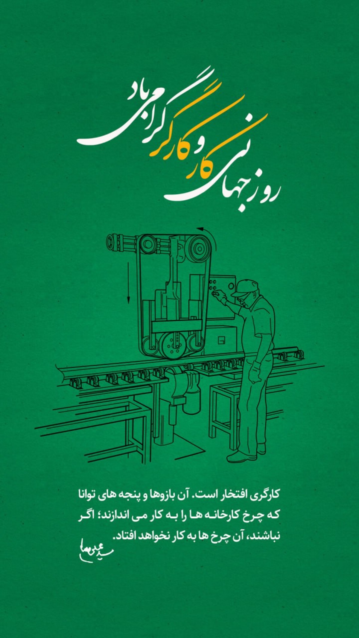 کارگری افتخار است. آن بازوها و پنجههای توانا که چرخ کارخانهها را به کارمیاندازند؛ اگر نباشند، آن چرخها به کار نخواهد افتاد.
